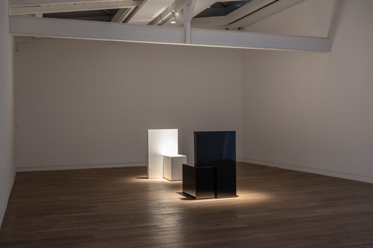 Father's Chair, 2022, wood, painted (white), 110 x 70 x 70 cm // Father's Chair, 2022, wood, painted (black), 110 x 70 x 70 cm. bernier-eliades/ Photograph: Linda Inconi-Jansen