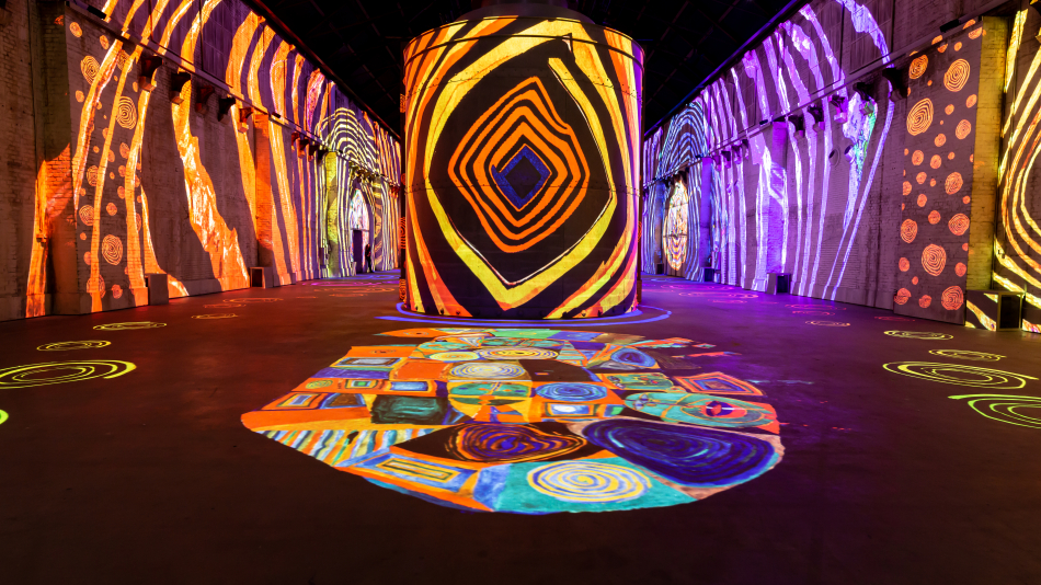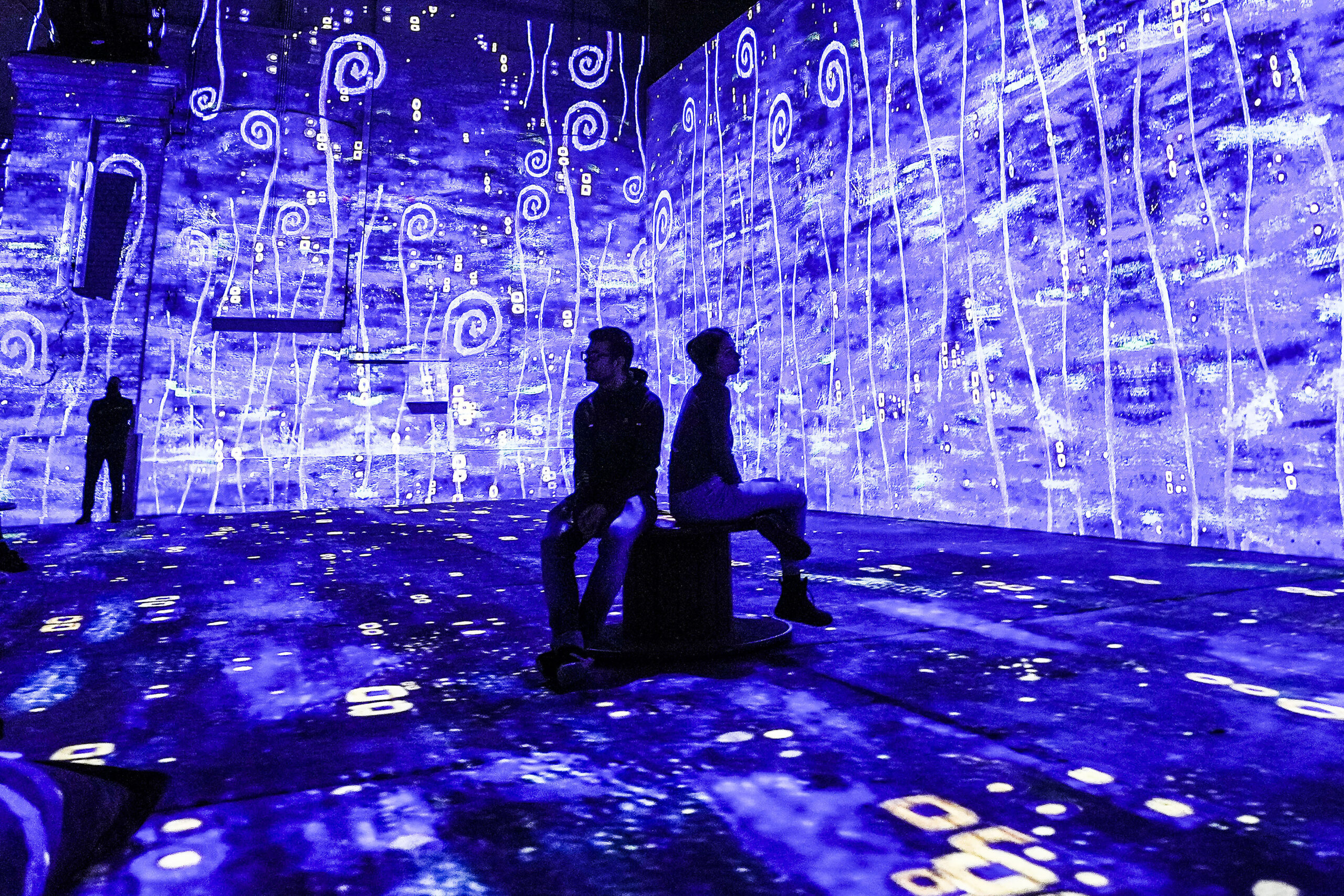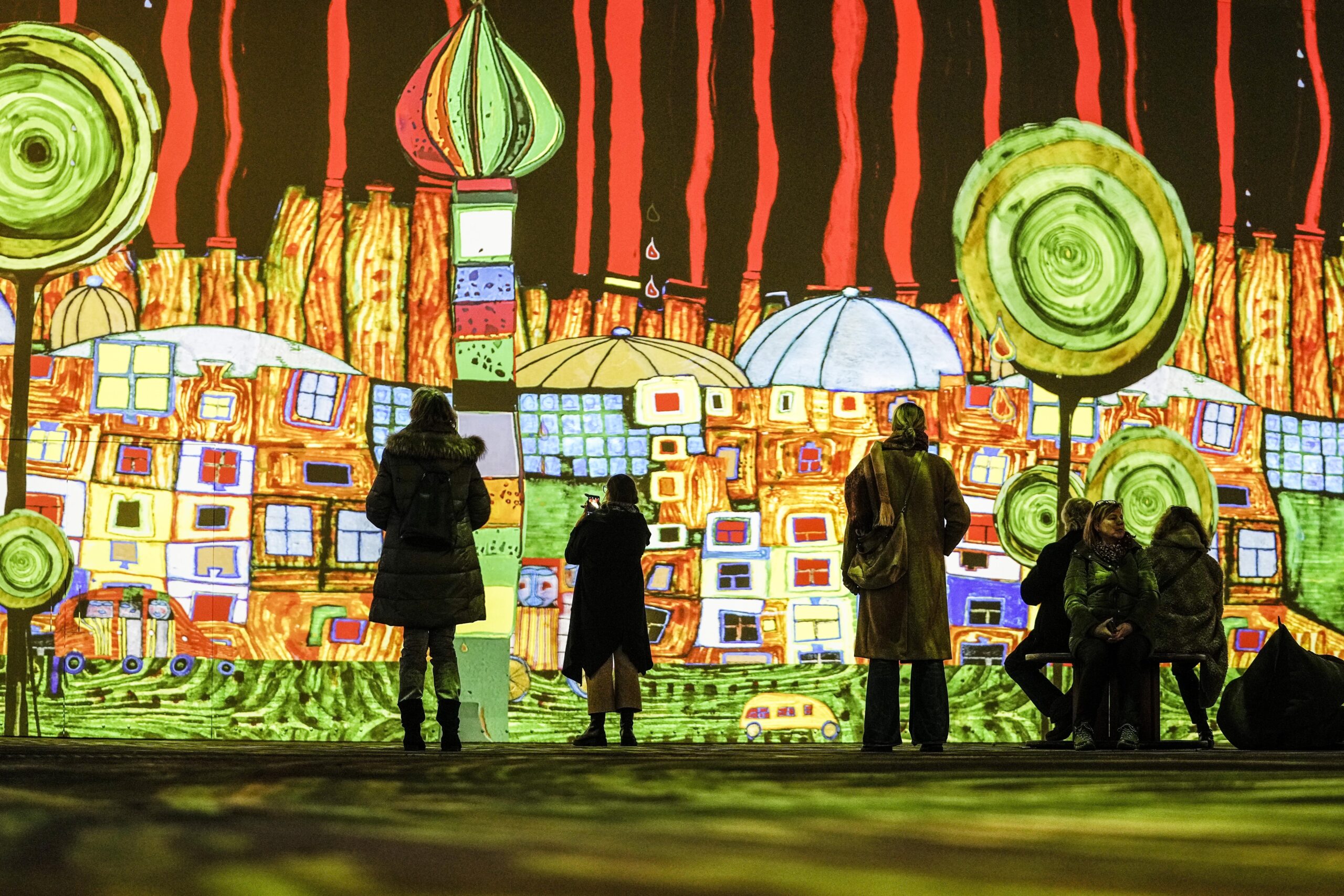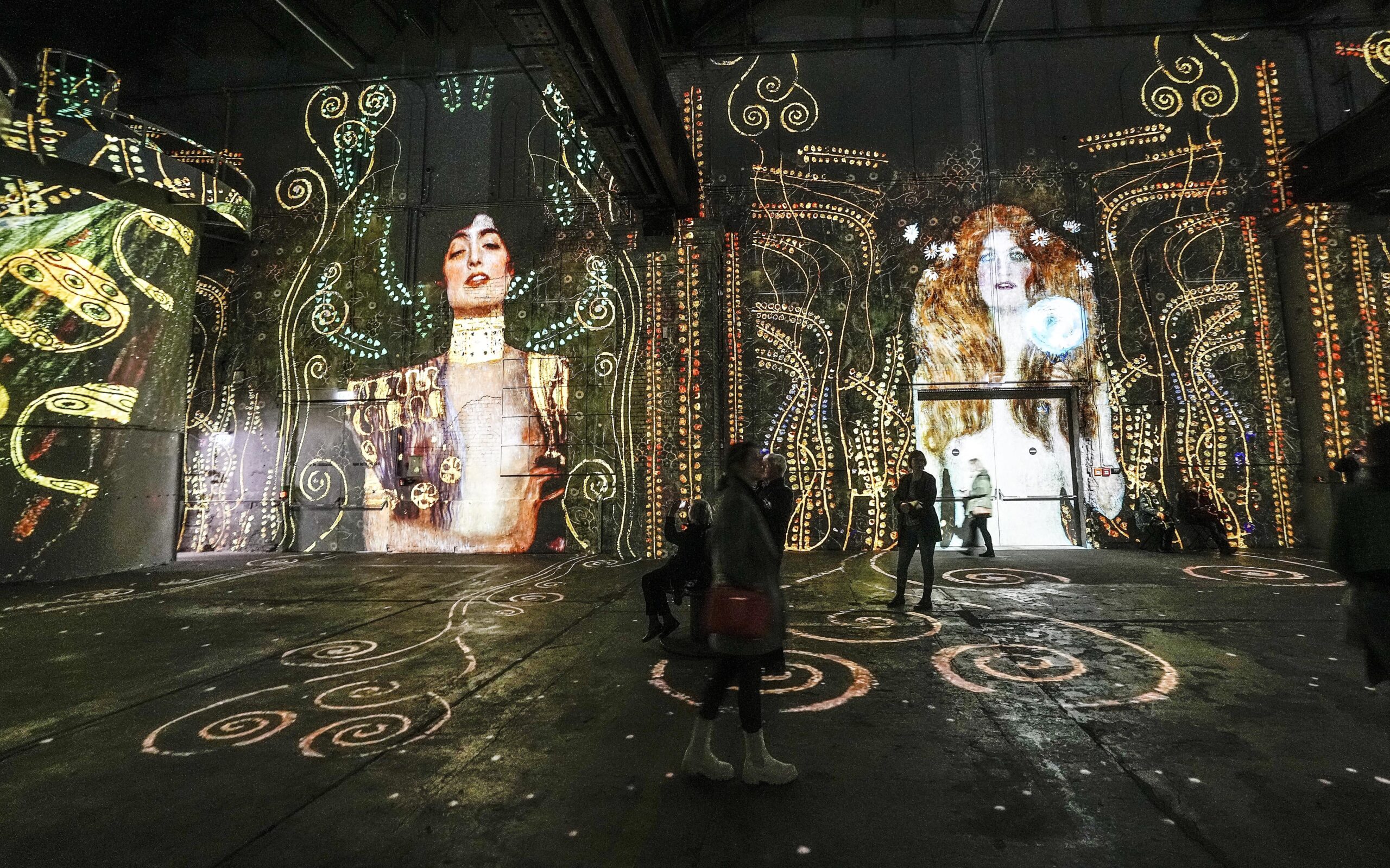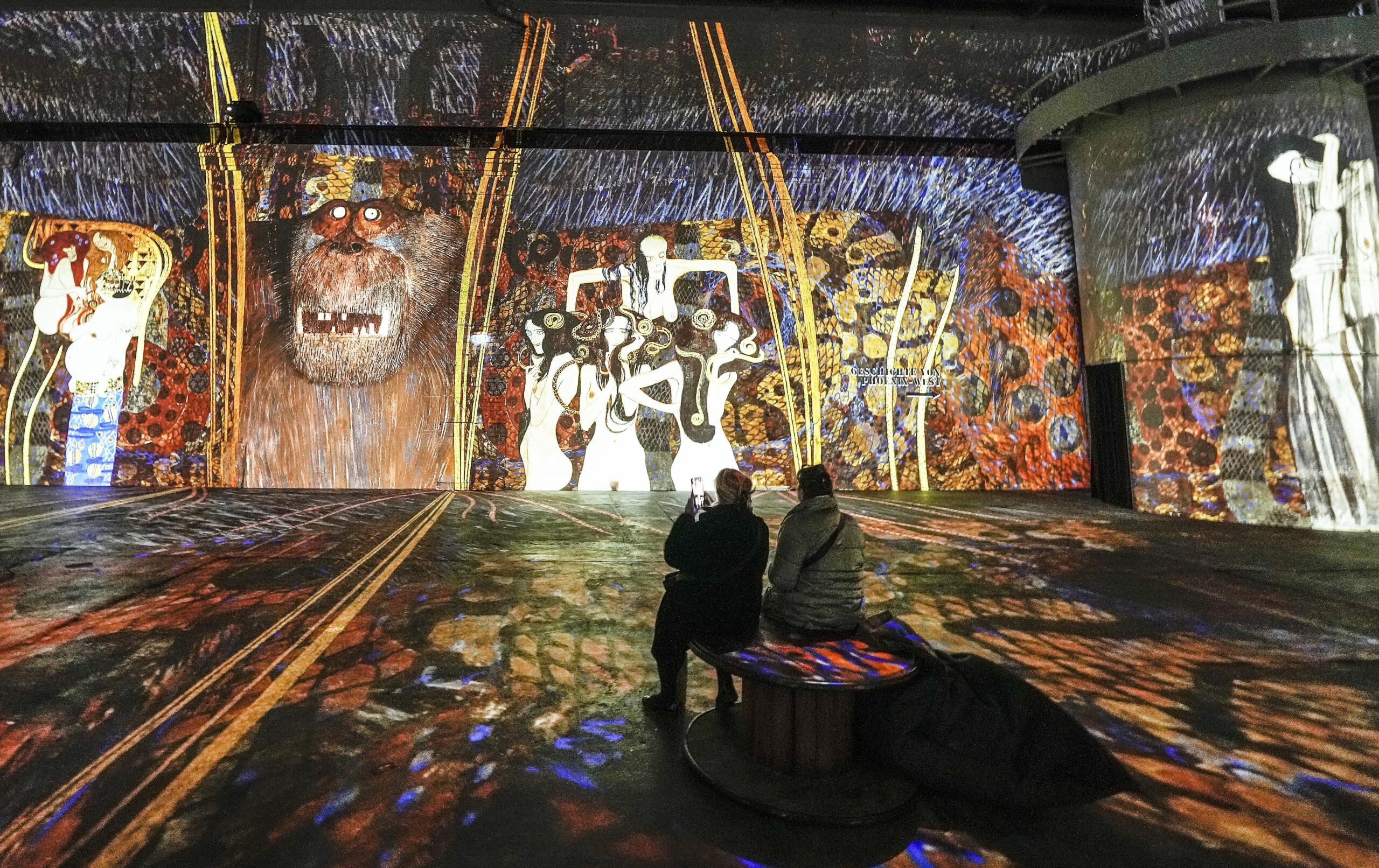 Βιντεοπροβολείς, ηχεία και τρισδιάστατες απεικονίσεις έργων του Κλιμτ και του Χούντερτβάσερ σε φαντασμαγορική έκθεση που "ζωντανεύει έργα του Κλιμτ και του Χούντερτβάσερ.