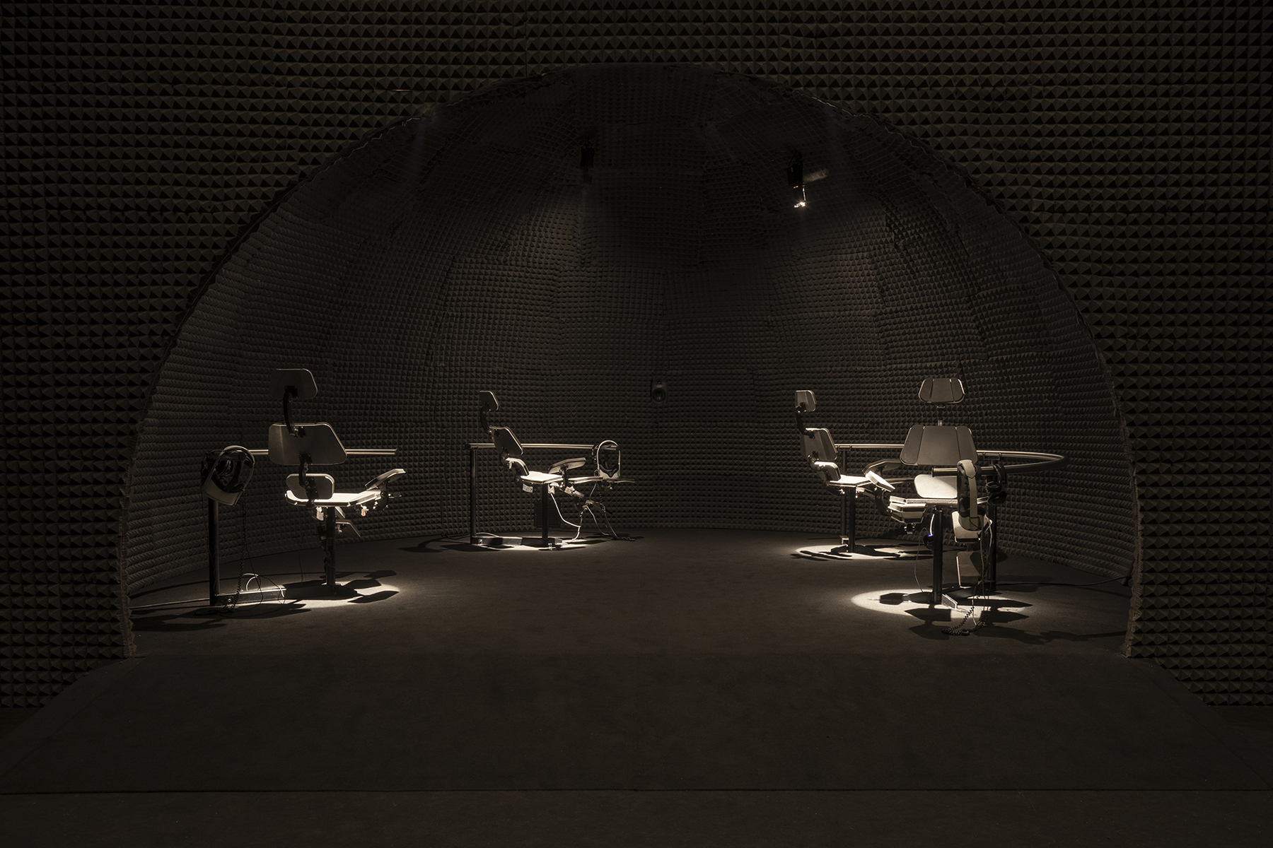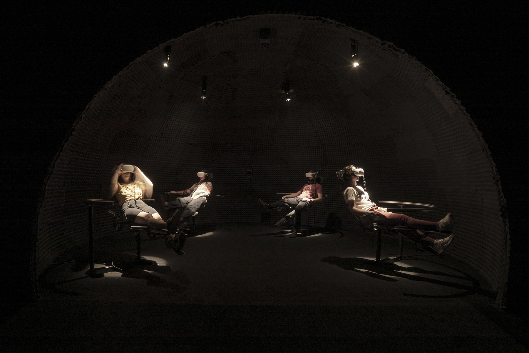 O χώρος σκοτεινός, μια “βουτιά” στο υποσυνείδητο. Στο βάθος, παράξενα υβριδικά καθίσματα “δονούνται” μέσα σε ημισφαιρικούς θόλους, όπου άνθρωποι σχεδόν ξαπλωμένοι επάνω τους, φορώντας γυαλιά εικονικής πραγματικότητας, μεταφέρονται σε ένα παράλληλο χωροχρόνο.