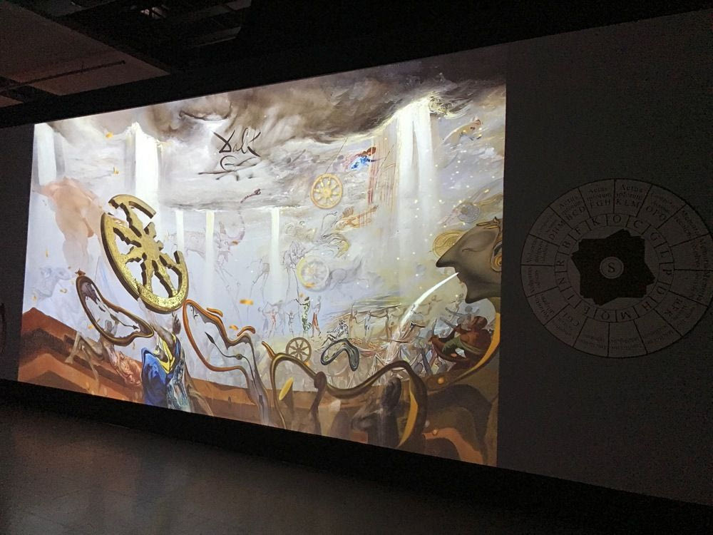Ένα αναλυτικό χρονολόγιο, με φωτογραφίες έργων και τις βασικές ιδέες της ζωγραφικής του μας έδωσε την ευκαιρία να τοποθετηθούμε χρονικά πριν μπούμε στη βασική αίθουσα της έκθεσης όπου ένα οπτικοακουστικό σόου με όλες τις φάσεις και τους πίνακες του Νταλί αποδομούνται και φτάνουν στα μικρότερα δομικά σωματίδια της ύλης.