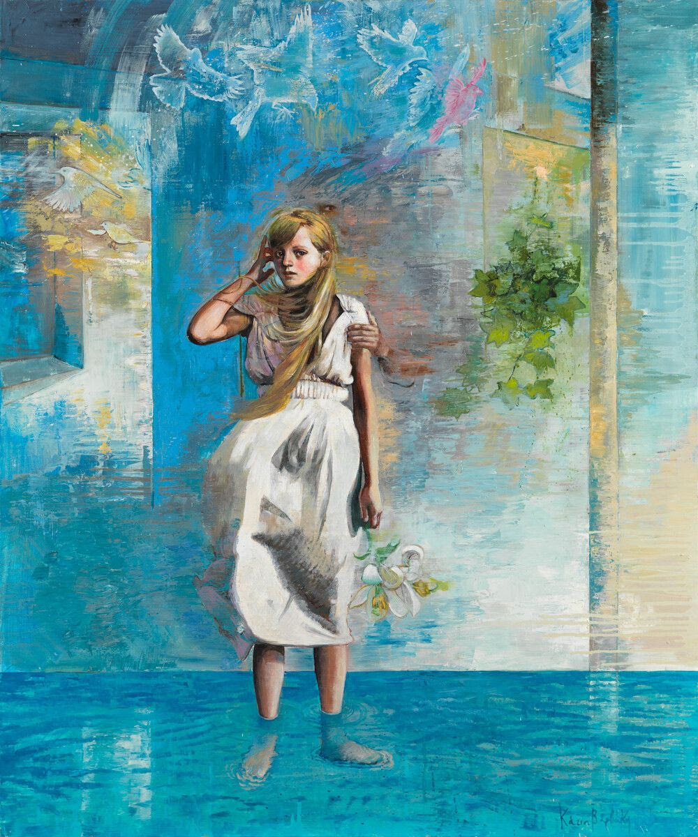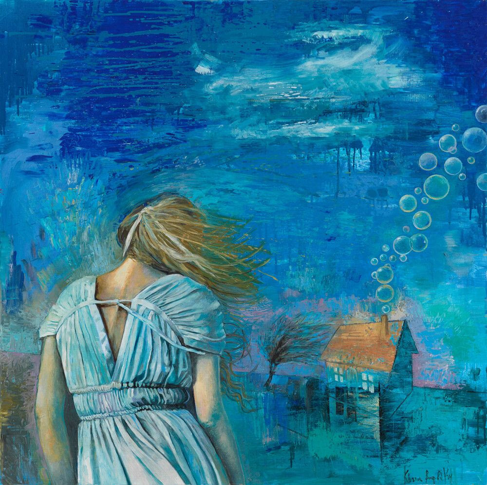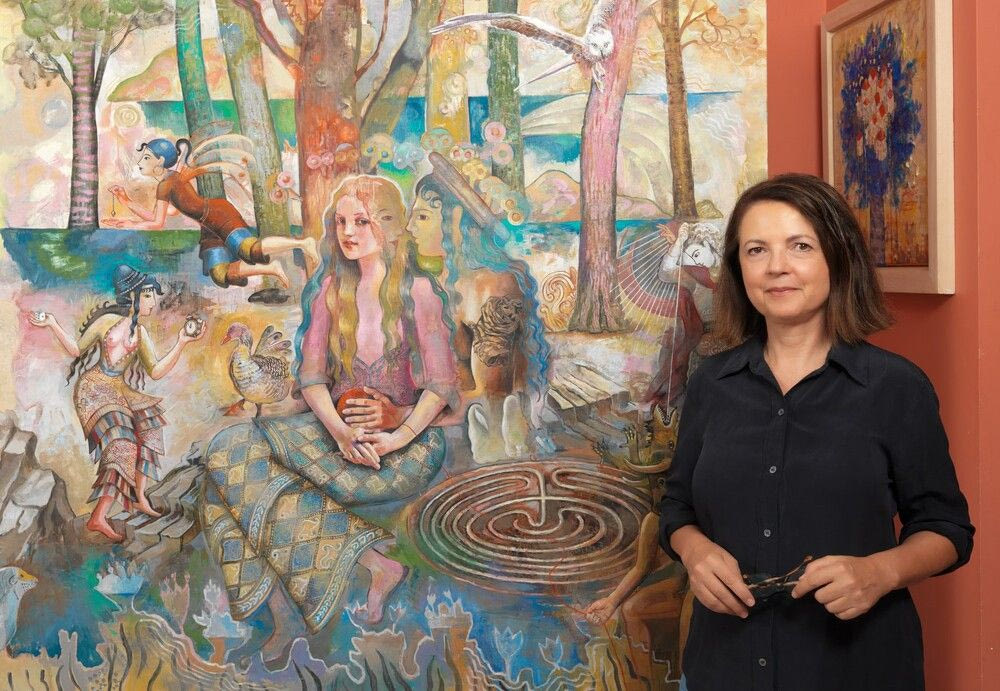 Στα έργα της ζωγράφου εικονίζονται παιδιά που δεν θέλουν να μεγαλώσουν, ενήλικες που θα ήθελαν να ξαναγίνουν παιδιά. Μικρά ενορχηστρωμένα θαύματα συντελούνται πίσω από γυάλινους διάφανους τοίχους, δέντρα μπλε θροΐζουν σε κάμπους άγνωστους, ένας μικρούλης κουρασμένος δράκος αποκοιμιέται τρυφερά και μια Αλίκη μας καλεί σε νέα χώρα θαυμάτων.