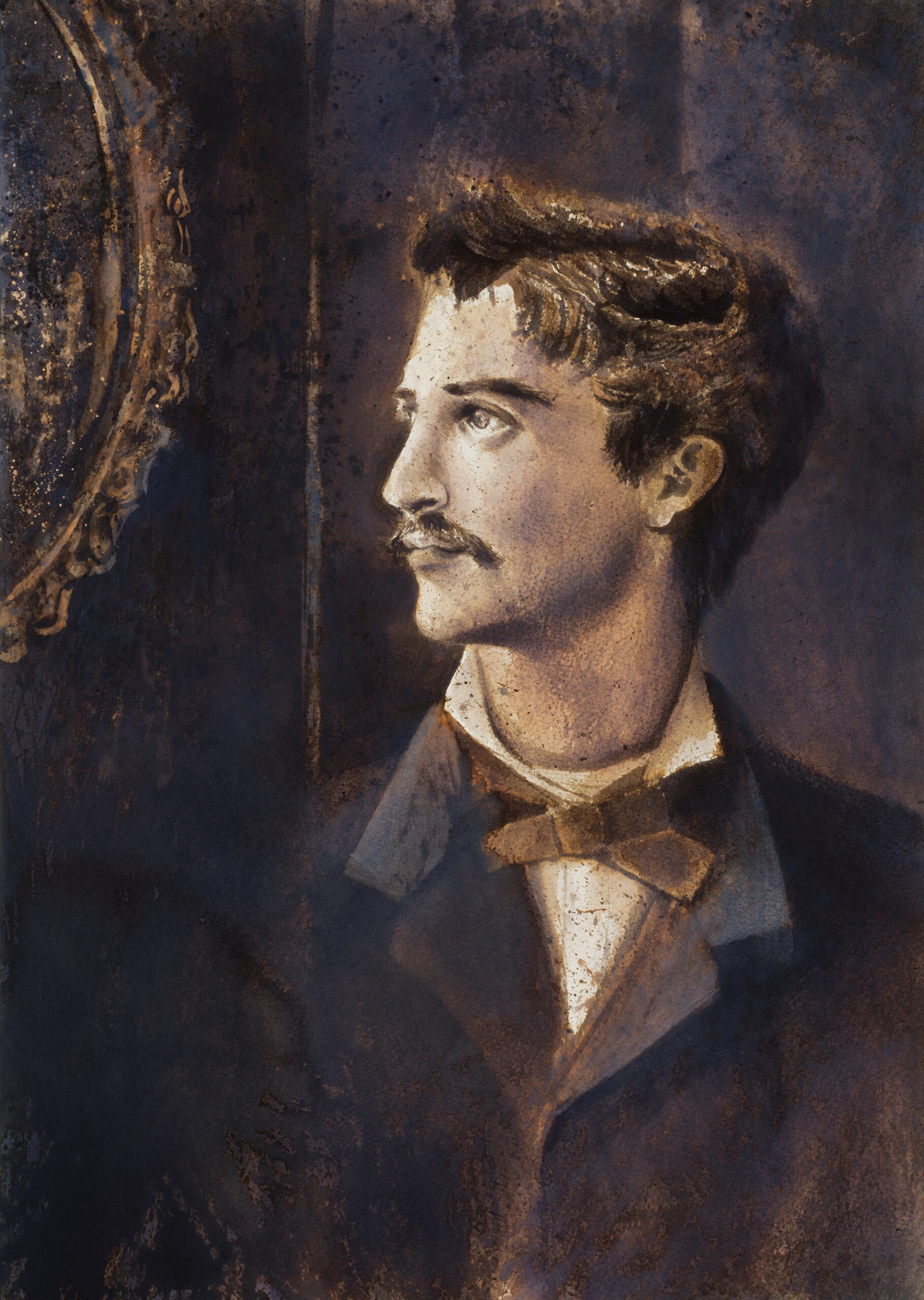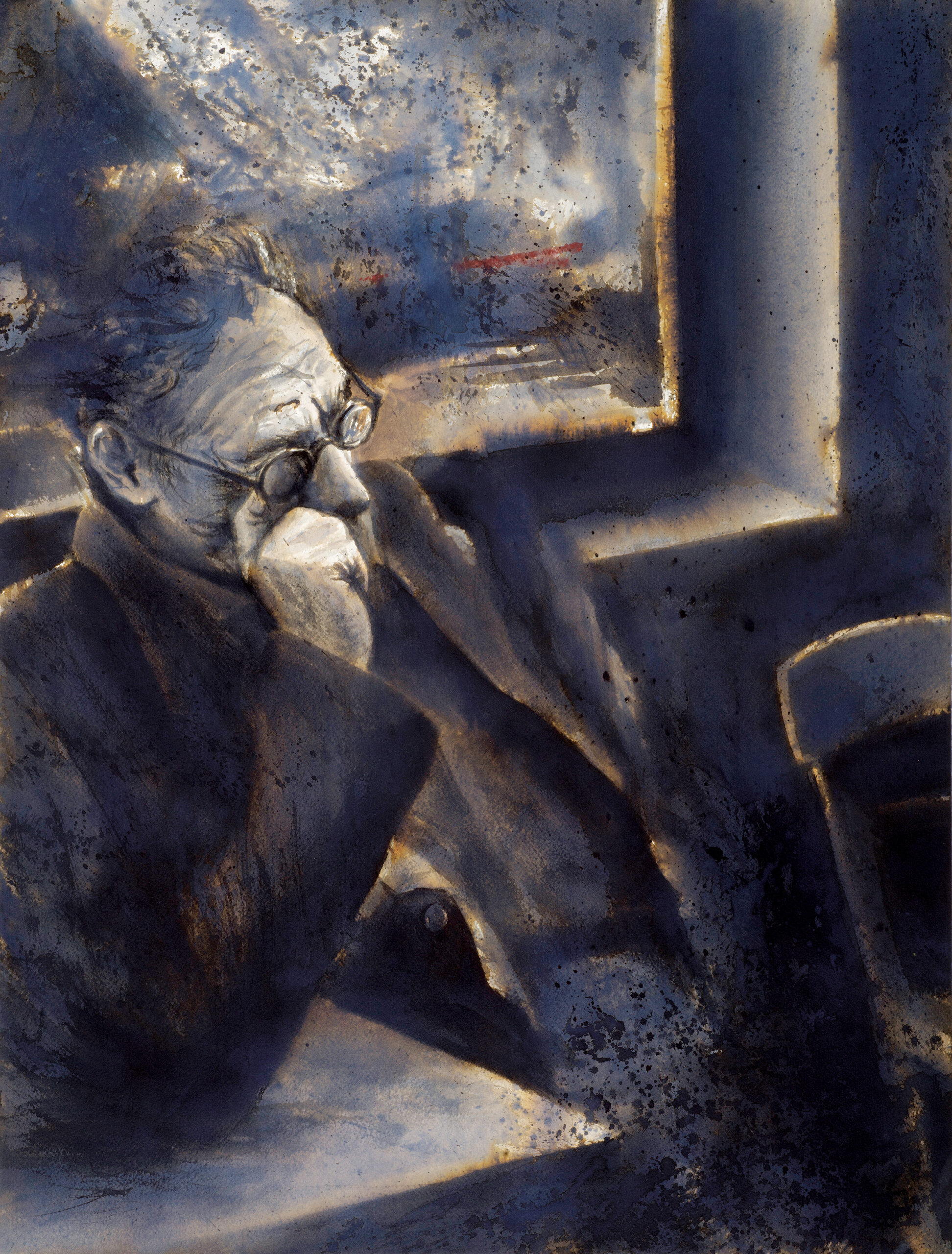 Παράξενα οικείο μας φαίνεται το πορτρέτο του ποιητή, τοποθετημένο σε κεντρικό σημείο του χώρου. Κοιτάει σκεπτικός. Ένα έργο που δεν βασίζεται σε κάποια φωτογραφία. “Προσπάθησα να τον φανταστώ σε ένα καφενείο, όπως και οι ήρωες που περιγράφει” μας είπε ο Ανδρέας Γεωργιάδης.