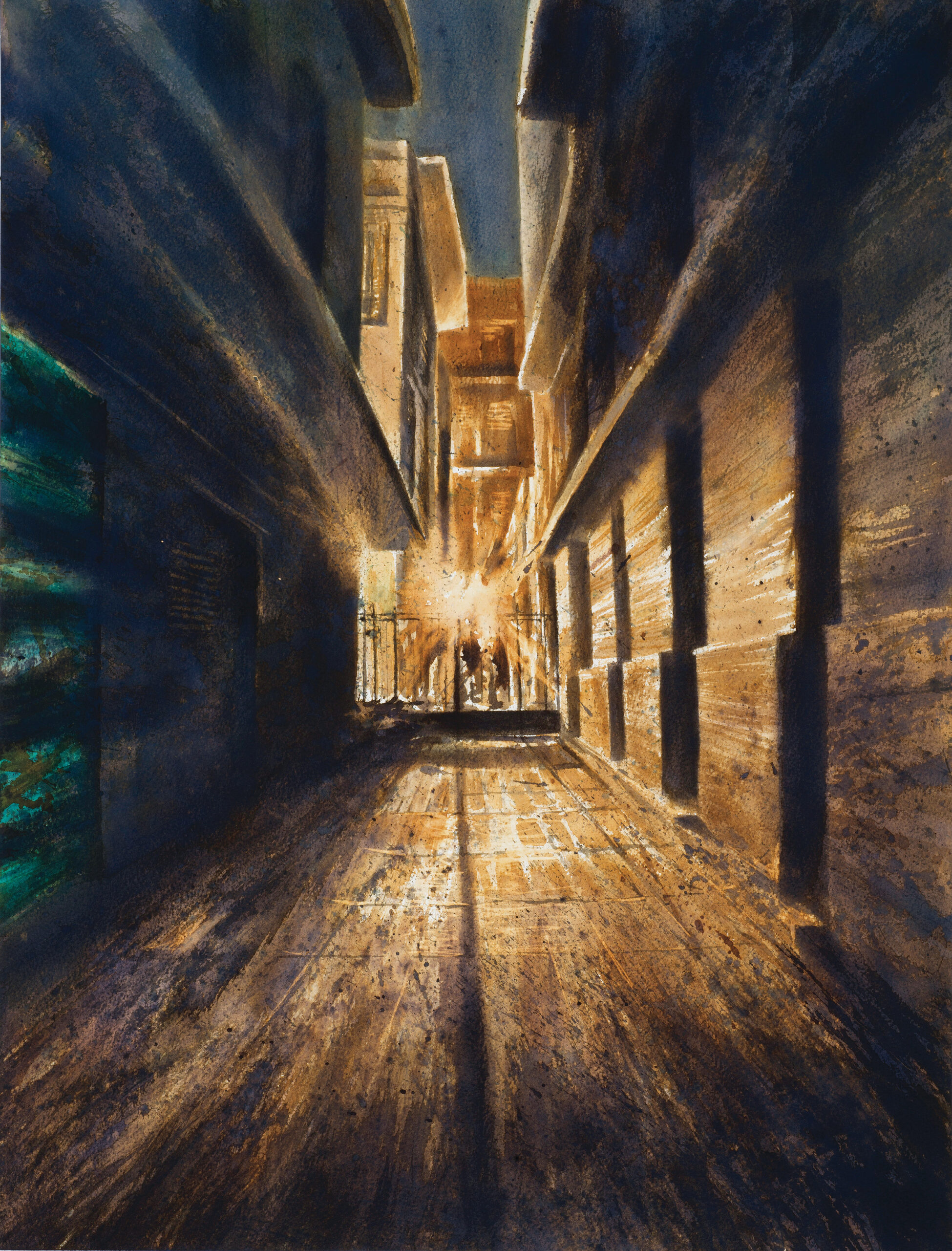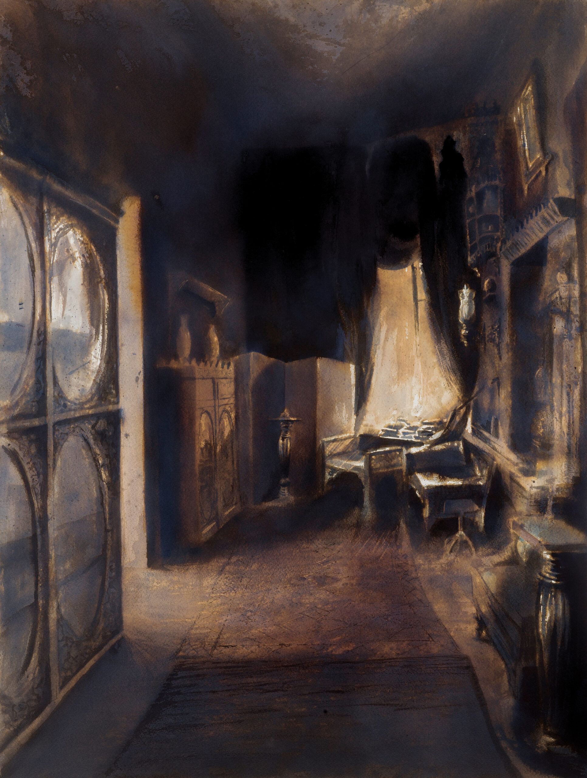 Ένας πίνακας με την ανοιχτή πόρτα που οδηγεί στο δωματιάκι που χρησιμοποιούσε ο Καβάφης σαν “τυπογραφείο” και είχε εκεί τα μονόφυλλά του. Εκεί τα συνέθετε για να δημιουργήσει κάθε φορά μια καινούργια και πρωτότυπη ανθολογία των ποιημάτων του, ανάλογα με τον εκάστοτε παραλήπτη.