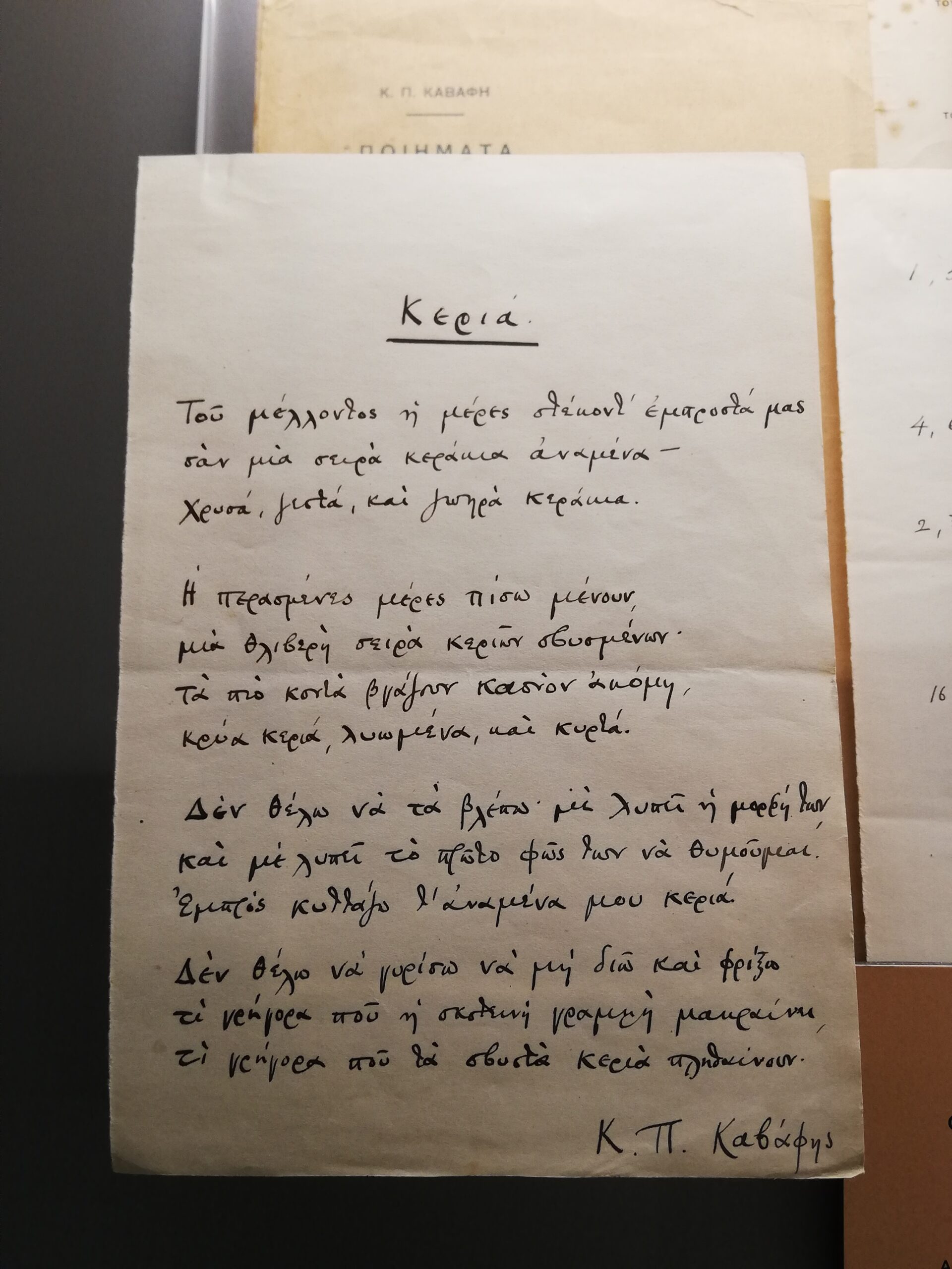 Δέος νιώσαμε και πάνω από το χειρόγραφο του ποιήματος “Κεριά”, το οποίο ενέπνευσε και τον ομώνυμο πίνακα της έκθεσης. Ο γραφικός χαρακτήρας του Καβάφη είναι ένα έργο τέχνης από … μόνος του!