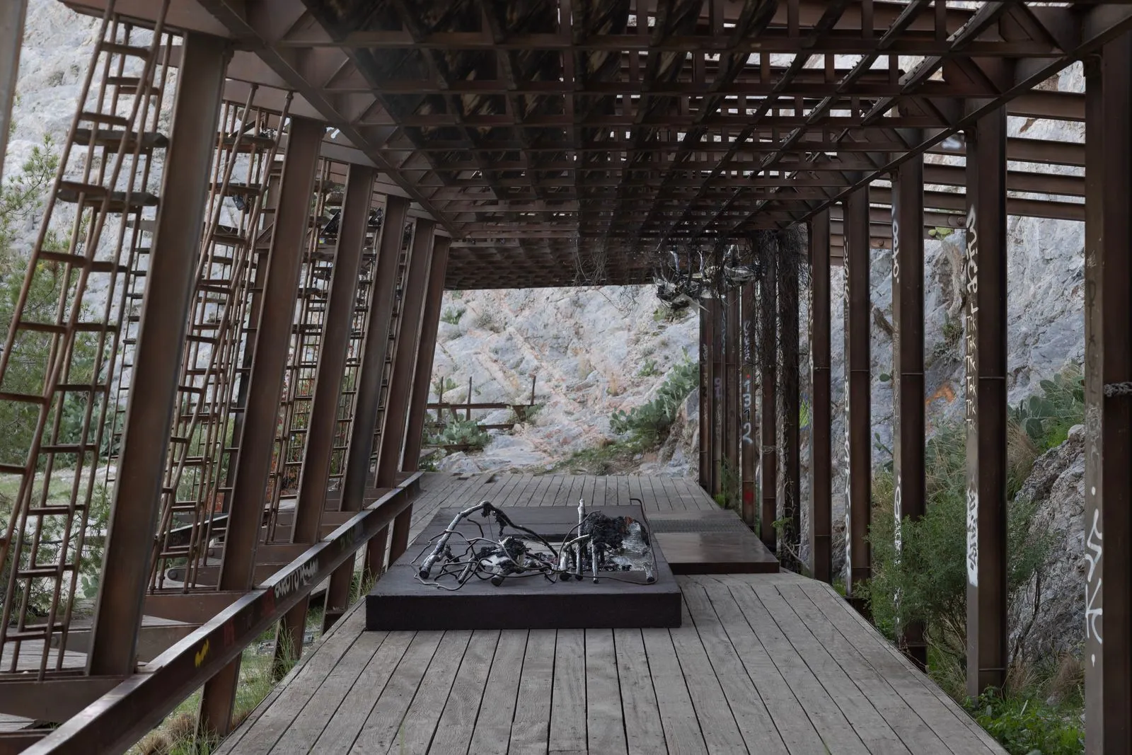 Athens Dies In Dreams At Sunrise, Αλέξανδρος Τζάννης, 2025 Σίδηρος, χυτοσίδηρος, μπρούτζος, χαλκός, αλουμίνιο, μαγνήτες, ρητίνη, άμμος, χαλίκια, ξύλο, ύφασμα. Ανάθεση νέου έργου από τον ΝΕΟΝ για το Έργο στην Πόλη 2025. Ναταλία Τσουκαλά / Ευγενική παραχώρηση ΝΕΟΝ και ο καλλιτέχνης