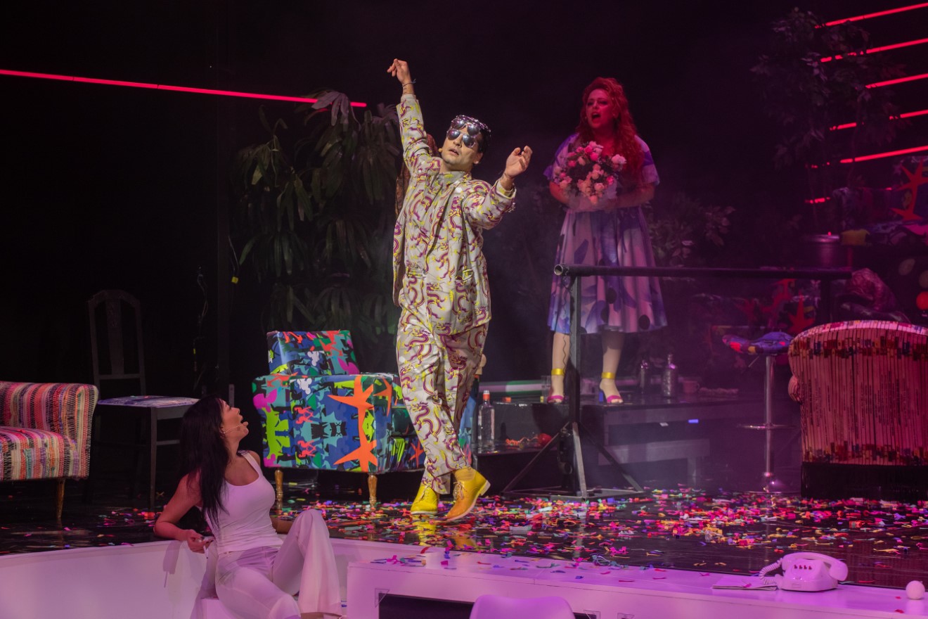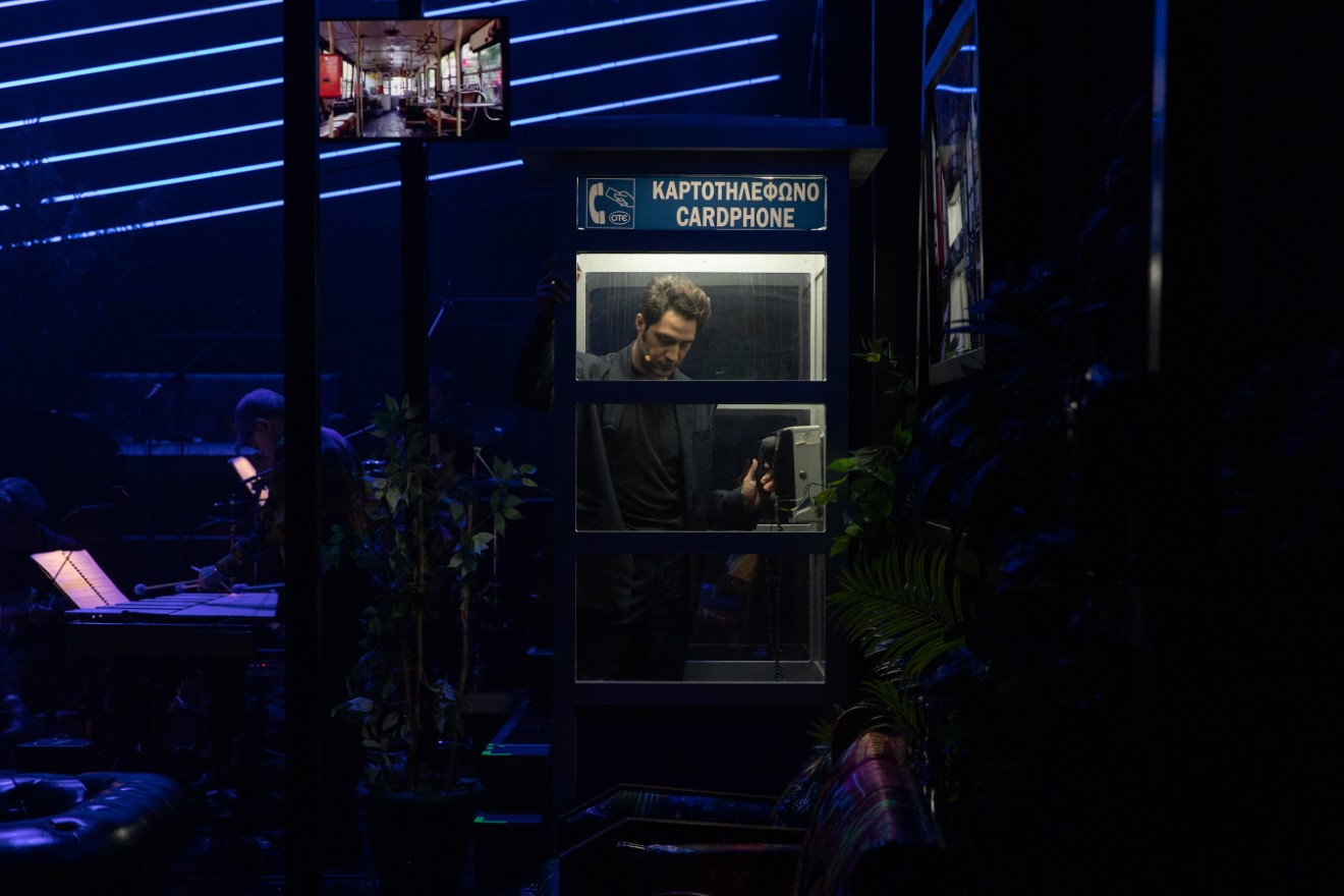 - Κωνσταντίνος Ρήγος και Μαίρη Τσαγκάρη δημιούργησαν ένα σύγχρονο εικαστικό σύμπαν που έμοιαζε με πολυμορφικό, παραισθησιογόνο lounge μέσα στο οποίο χώρεσαν όλα. Πίσω δεξιά η μπάντα που έπαιζε ζωντανά μουσική, μπροστά της τα εμβληματικά καρτοτηλέφωνα της δεκαετίας του ‘90 και διάσπαρτοι πολύχρωμοι καναπέδες, πολυθρόνες, τραπέζια. Στο κέντρο της σκηνής κι εντός της δέσποζε ένα λευκό πιλοτήριο στο οποίο βρισκόταν ο Ρένος Χαραλαμπίδης.