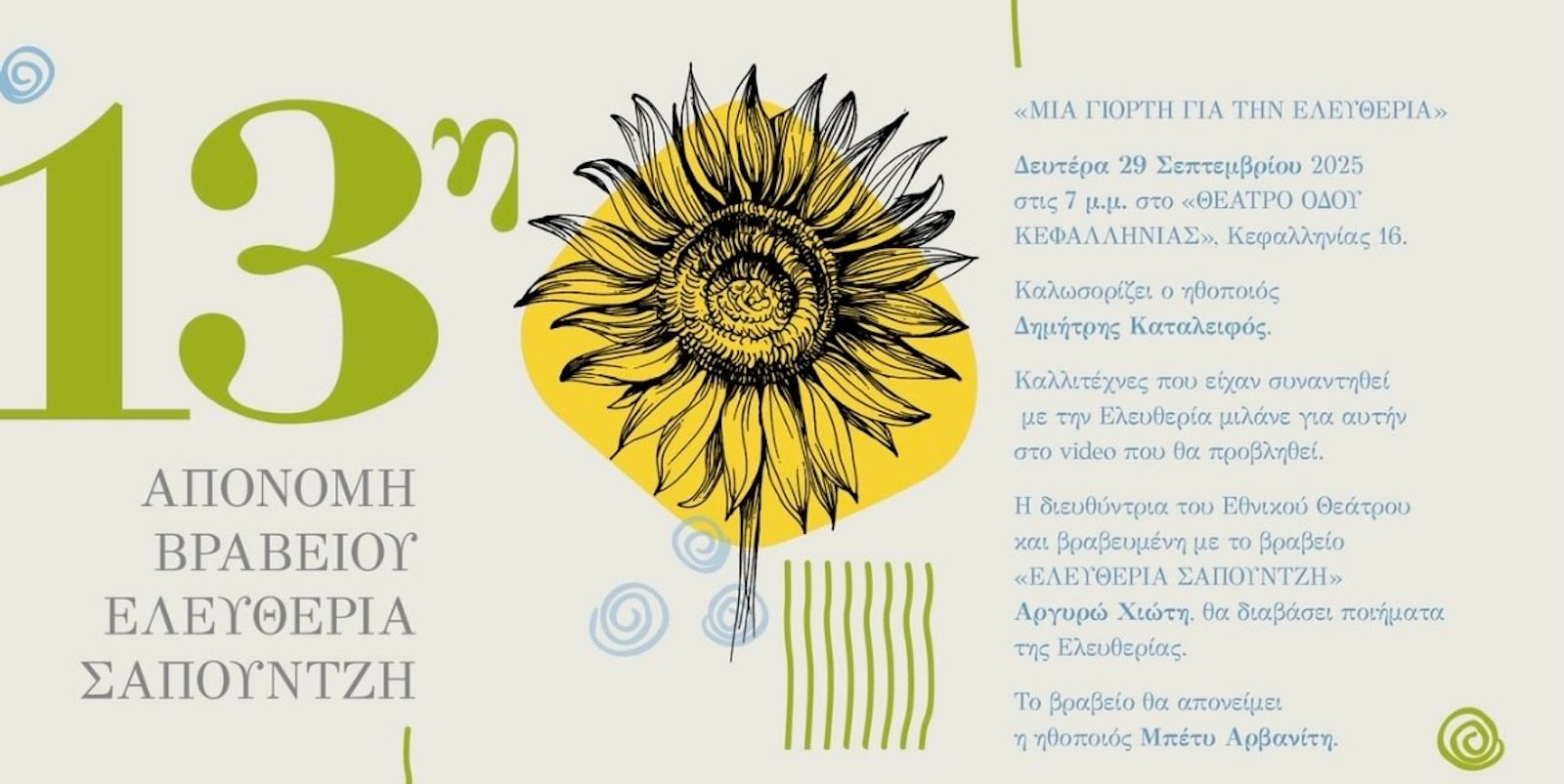 Τη Δευτέρα 29 Σεπτεμβρίου, στις 19:00, το Θέατρο Οδού Κεφαλληνίας (Κεφαλληνίας 16, Κυψέλη) θα φιλοξενήσει την απονομή του φετινού βραβείου «Ελευθερία Σαπουντζή». Η είσοδος για το κοινό θα είναι ελεύθερη, προσκαλώντας τους φίλους του θεάτρου να παρακολουθήσουν μια σημαντική στιγμή της σύγχρονης καλλιτεχνικής σκηνής.