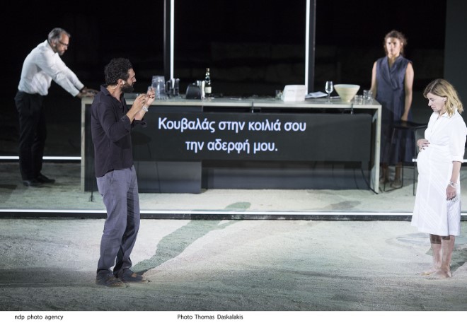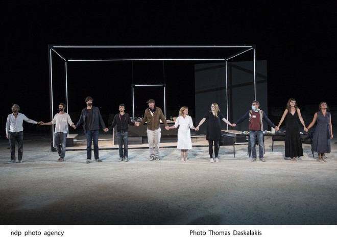 Η απάντηση είναι πως όχι. Χάθηκε μέσα στην τεράστια αργολική ορχήστρα. Δεν ήταν λίγες οι φορές μάλιστα που παρόλο που καταλαβαίναμε τη σκηνοθετική λογική, αισθανόμασταν πως βούλιαζε εντός της. Και ήταν πολύ περισσότερες οι φορές που σκεφτόμασταν πόσο καθαρότερο θα ήταν το έργο αυτό σ΄έναν κλειστό και πιο διαχειρίσιμο χώρο, όπως αυτός της Πειραιώς 260. Όχι, στην Επιδαύρια παγκόσμια πρεμιέρα του έργου δε λειτούργησαν ούτε τα κοντινά πλάνα στα πρόσωπα των ηθοποιών που προβάλλονταν στο video wall που ήταν τοποθετημένο στη σκηνή (στην ορχήστρα έμπαιναν σε τακτά διαστήματα άνθρωποι με κάμερες στο χέρι και βιντεοσκοπούσαν κοντινά προσώπων) ούτε το drone που σηκώθηκε και απεικόνισε όλο το θέατρο της Επιδαύρου από ψηλά.