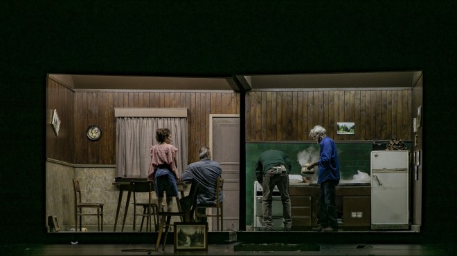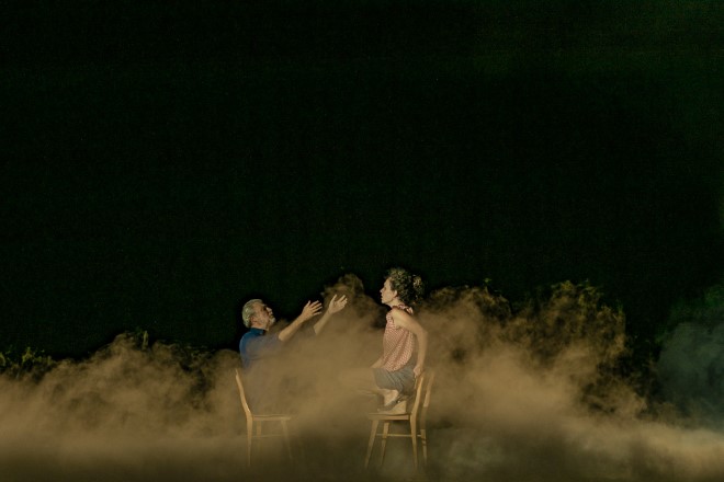 Έστησε λοιπόν με την Εύα Μανιδάκη ένα εντυπωσιακό μετεωριζόμενο σκηνικό – που ορισμένες φορές θύμιζε στο μαύρο του φόντο πίνακες του Χόπερ- και το άφησε να κινείται και να στροβιλίζεται στον χωροχρόνο υπό την εκπληκτική μουσική υπόκρουση του Άγγελου Τριανταφύλλου. Στην παράσταση αυτή λόγος και μουσική γίνονται ένα. Η μουσική είναι αυτή που δίνει πνοή στον λόγο, είναι αυτή που κινεί τους ήρωες και αναλαμβάνει τον ρόλο της εικονοποιίας. Ο Άγγελος Τριανταφύλλου στην καλύτερη του μάλλον μουσική στιγμή συνθέτει θαυμάσιες επικολυρικές συνθέσεις και με τη βοήθεια στους ηλεκτρονικούς ήχους του Γιώργου Πούλιου στήνει ένα πανέμορφο ηχοτοπίο. Οι σκηνές της Τιτανομαχίας και της περιπλάνησης της Ιούς σε όλον τον κόσμο συγκλονίζουν, καθώς εκεί γίνεται απόλυτα ορατό το πώς η μουσική μπορεί όχι μόνο να “ντύσει” μία παράσταση, αλλά και να αποτελέσει τον απόλυτο πρωταγωνιστή της.