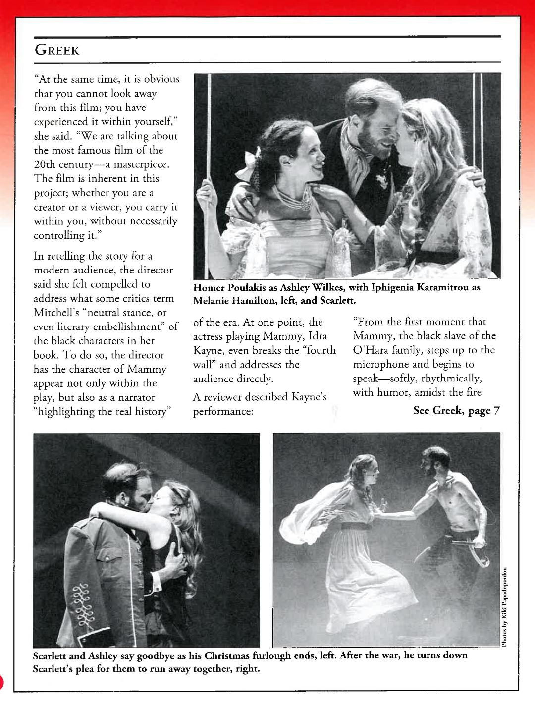 Στο κείμενό του, φιλοξενεί, επίσης, δηλώσεις της σκηνοθέτιδας, αναφέρεται στη μεταφορά στη σκηνή δύο μνημειωδών λογοτεχνικών έργων μέσα από πρωτότυπες θεατρικές διασκευές, το “Πόλεμος και Ειρήνη” και το “Περηφάνια και Προκατάληψη”, από τους δύο Έλληνες συγγραφείς πριν το «Όσα παίρνει άνεμος», και πραγματοποιεί ειδική μνεία στη μουσική του Γιώργου Παλαμιώτη για την παράσταση που «κάθε του τραγούδι προχωράει την ιστορία και βαθαίνει τους χαρακτήρες» του έργου. Το αφιέρωμα κλείνει με αναφορά στο εντυπωσιακό ρεκόρ προσέλευσης των 16.000 θεατών που κατέκλυσαν μέσα σε ένα μήνα τον Δημοτικό Θέατρο Πειραιά για να παρακολουθήσουν την παράσταση.