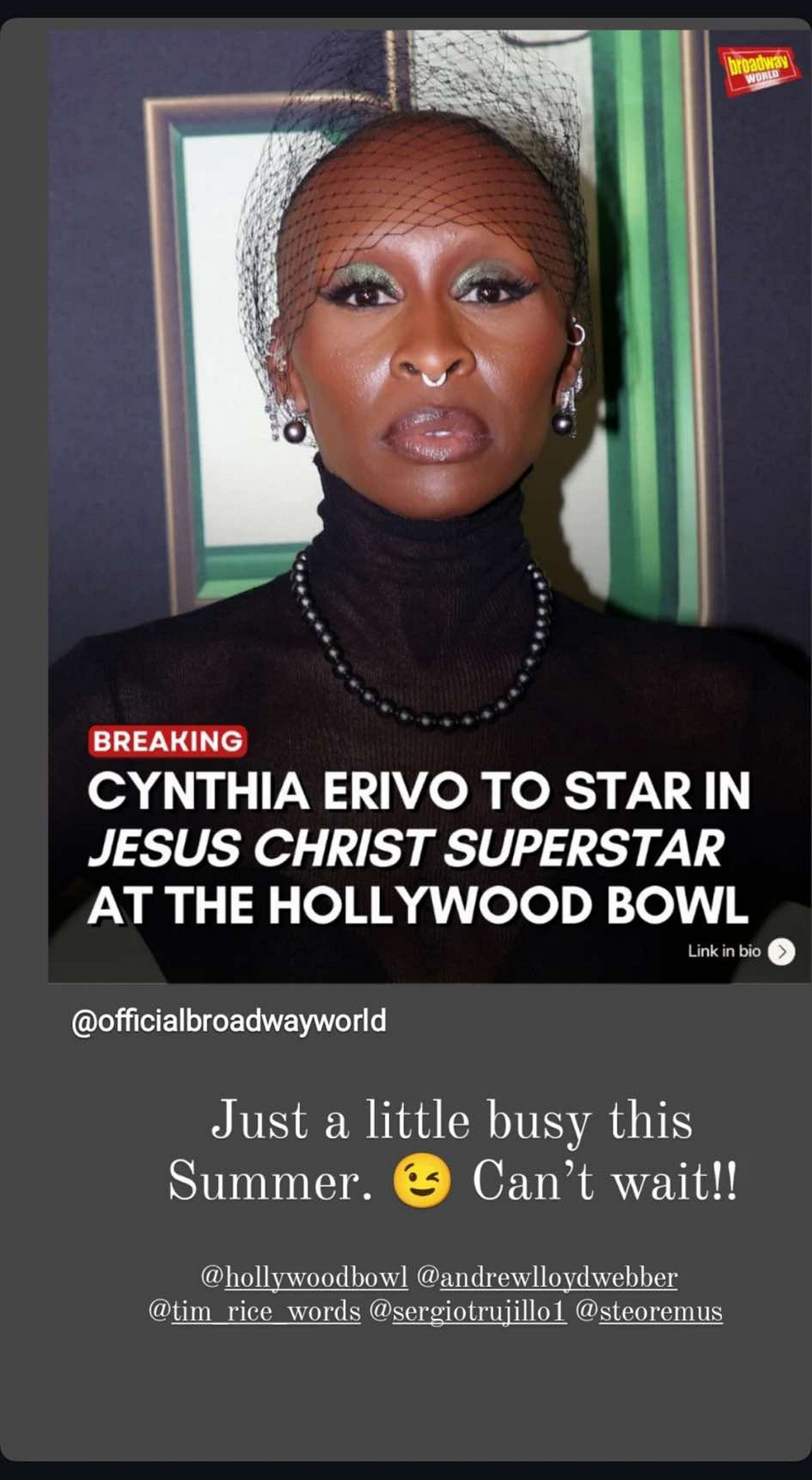 Την είδηση μετέδωσε το Variety, ενώ αργότερα, σε ανάρτησή της στο Instagram, η 38χρονη σήμερα Erivo έγραψε: «Απλά, θα είμαι λίγο απασχολημένη αυτό το καλοκαίρι… δεν μπορώ να περιμένω».