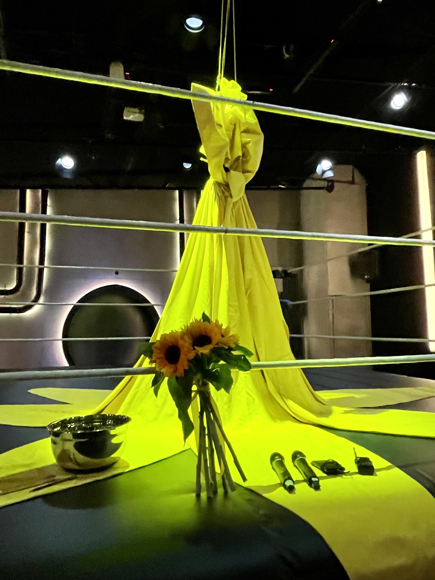 Με ένα τεράστιο ηλιοτρόπιο φόρεμα κρεμασμένο σαν σε τσιγκέλι από το ταβάνι. Ένας φορέσιμος σάκος του μποξ, για τα πιο ηρωικά της απωθημένα. Σε μια πάλη γελοία κι επικίνδυνη μαζί. Ως να γίνει χορός που νανουρίζει τους φόβους -αν έτσι βιώνει την αγάπη μια ψυχή που μεγαλώνει. Κι όπως γράφει περιμετρικά το σύνθημα στο ρινγκ, ανέβα κι εσύ αγάπη μου αν τολμάς. Και διαβάζεται όπως θες. Κι εσύ αν τολμάς αγάπη μου ανέβα, αγάπη μου ανέβα αν τολμάς κι εσύ. Και πάει. Και πάμε μαζί της. Με ένα κερασάκι στη θέση κάθε θεατή. Κι όλη η παλαίστρα, τούρτα. Και το μάρμαρο απαλό σαν χάδι. Κι ο βωμός της πάλης ασφαλής, να βγει από τα εισαγωγικά του.