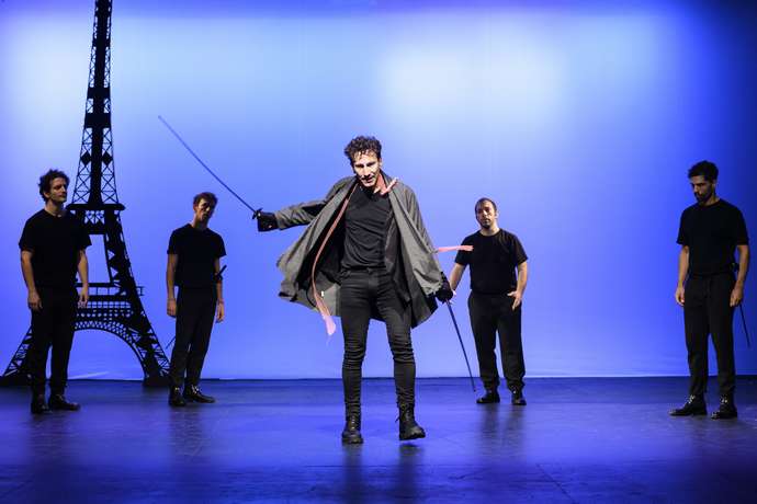 Ίσως αυτό ήταν εφικτό υπό μία άλλη σκηνοθετική ματιά, ίσως στη λογική που ο ίδιος συμπύκνωσε τον “Αίαντα”. Εδώ, όμως, μιλάμε για μία πολυπρόσωπη παράσταση δυόμισι περίπου ωρών που τηρεί τη γνωστή γραμμική λογική στην οποία αρέσκεται ο Νανούρης, διανθισμένη μάλιστα με κλισέ αστεϊσμούς και ευρήματα (δεν είναι λίγες οι φορές που οι ηθοποιοί διακόπτουν τη ροή της παράστασης και απευθύνονται ο ένας στον άλλο με τα αληθινά τους ονόματα και ακούμε εκφράσεις όπως “Μιχάλη, ξέχασες τον βράχο” ή “Άντώνη ρίξε φώτα”), ενώ πέραν του πρωταγωνιστικού διδύμου, όλοι οι άλλοι ηθοποιοί μοιάζουν ακαθοδήγητοι και αποδίδουν σχεδόν διεκπεραιωτικά τους ρόλους τους μέσα σε έναν ακατανόητο φορμαλισμό. Η δε σκηνογραφία δεν αναδύει σε καμία περίπτωση την αίσθηση μιας “χειροποίητης παράστασης” και αρκείται σε ένα πανί στο βάθος που απλώς φωτίζεται με διαφορετικά χρώματα, και έναν πύργο του Άιφελ που γέρνει ολίγον στην κορυφή του και είναι “στολισμένος” με φθηνές φωτισμένες γιρλάντες. Αυτή δε η “παρισινή” πινελιά μένει σταθερή και δεσπόζει και στο πεδίο της μάχης αργότερα, αλλά και στο μοναστήρι, όπου έχει καταφύγει η Ρωξάνη.