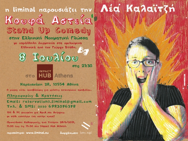 Η Liminal, μέλος του Impact Hub Athens, παρουσιάζει τη κωμικό Λέα Καλαϊτζή για μια μοναδική stand up comedy εμφάνιση με τίτλο ‘Κουφά Αστεία”.