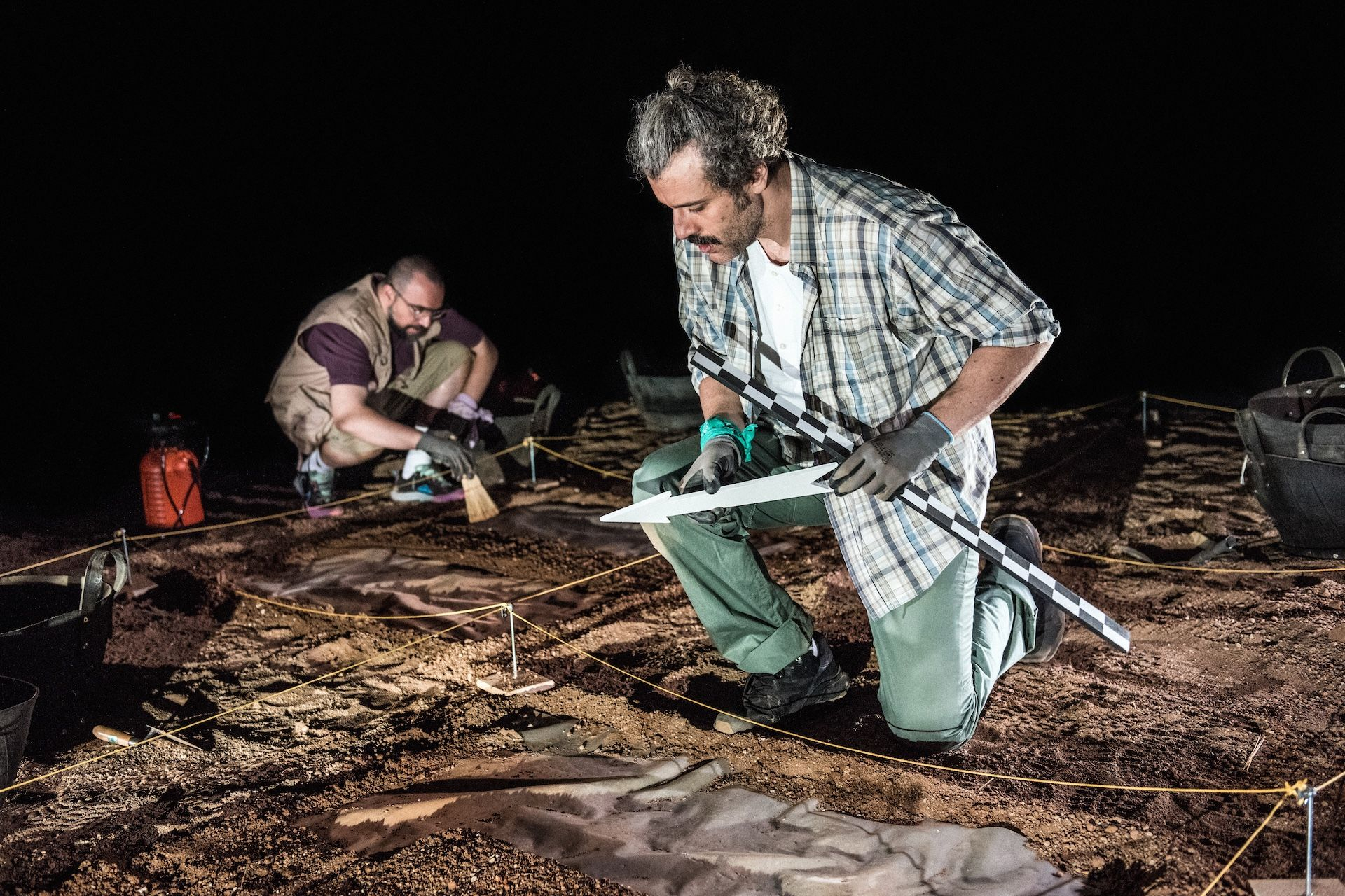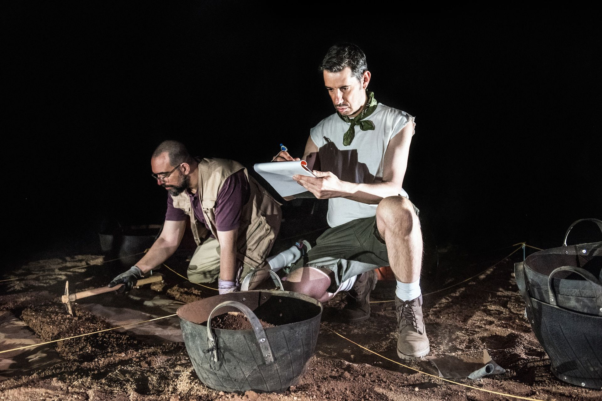 Στη σκηνή στήνεται μια παράδοξη, υπαρξιακή ανασκαφή που τα ευρήματά της δεν είναι, αυτή τη φορά, αγγεία ή αρχιτεκτονήματα, αλλά θεατρικοί στίχοι, λόγια αρχαίων ηθοποιών, σπασμένα σε μικρά κομμάτια.