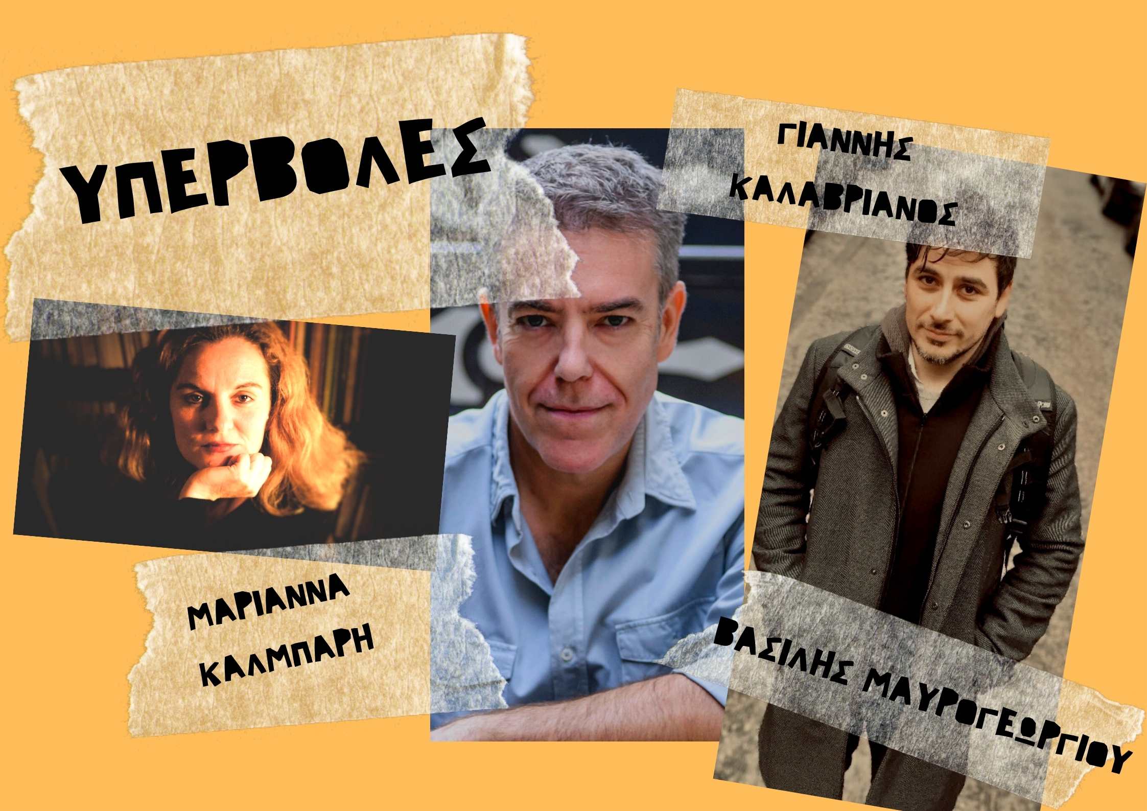 Ακολουθούν οι «ΥΠΕΡΒΟΛΕΣ» σε κείμενα-σκηνοθεσία του Γιάννη Καλαβριανού, της Μαριάννας Κάλμπαρη και του Βασίλη Μαυρογεωργίου. Υπό τη θεματική «Βία παντού», συγγραφείς που έχουν επίσης την ιδιότητα του/της σκηνοθέτη/τιδας αλλά και του/της ηθοποιού εργάζονται και συν-εργάζονται την περίοδο 2021-23 πάνω στην συγγραφή́ και την παρουσίαση νεοελληνικών κειμένων που μιλούν για τη φανερή και κρυμμένη βία που υπάρχει παντού γύρω μας. Η αρχή έγινε με το “Cry” της Λένας Κιτσοπούλου (πρώτη παρουσίαση Ιανουάριος 2022) και το “Motel” του Βασίλη Μαυρογεωργίου (πρεμιέρα 1η Απριλίου 2022). Το έργο «Υπερβολές» (προσωρινός τίτλος) επιθυμεί να οδηγήσει αυτό το μοντέλο συνεργασίας και δημιουργίας ένα βήμα παραπέρα, συνενώνοντας τρεις συγγραφείς-σκηνοθέτες που συμμετέχουν επιπλέον στο πρόγραμμα «Δραματουργία τώρα» και καλούνται τώρα να συνεργαστούν γράφοντας και να σκηνοθετώντας τρία μονόπρακτα πάνω στη θεματική της βίας που θα παρουσιαστούν σε ενιαία παράσταση. Στόχος είναι να γεννηθούν κείμενα που αντανακλούν τους σύγχρονους προβληματισμούς της ελληνικής αλλά και της παγκόσμιας κοινωνίας μέσα από μια διαφορετική “συν-εργατική”προσέγγιση και διαδικασία που συσπειρώνει μια ομάδα καλλιτεχνών στο Θέατρο Τέχνης.