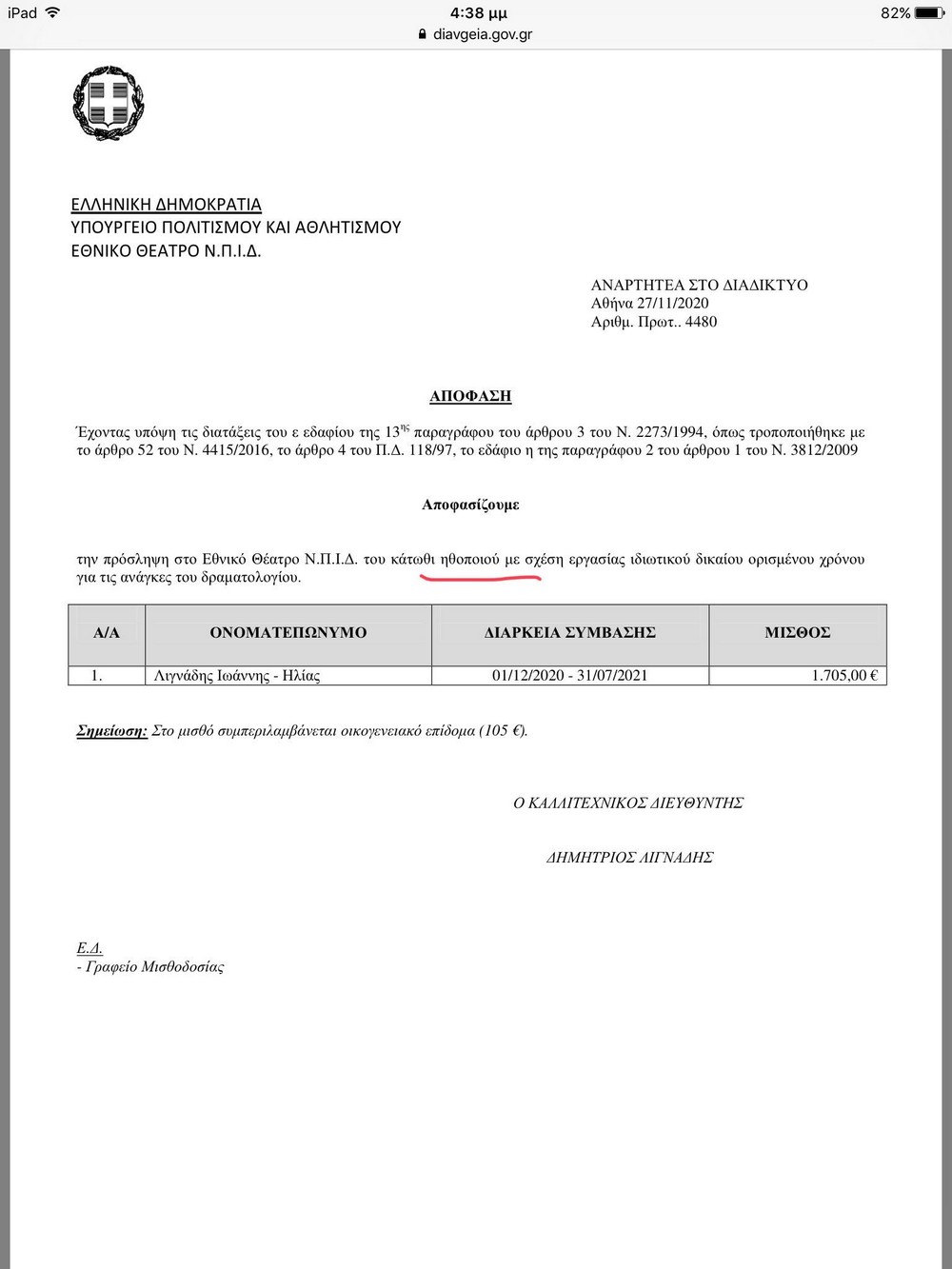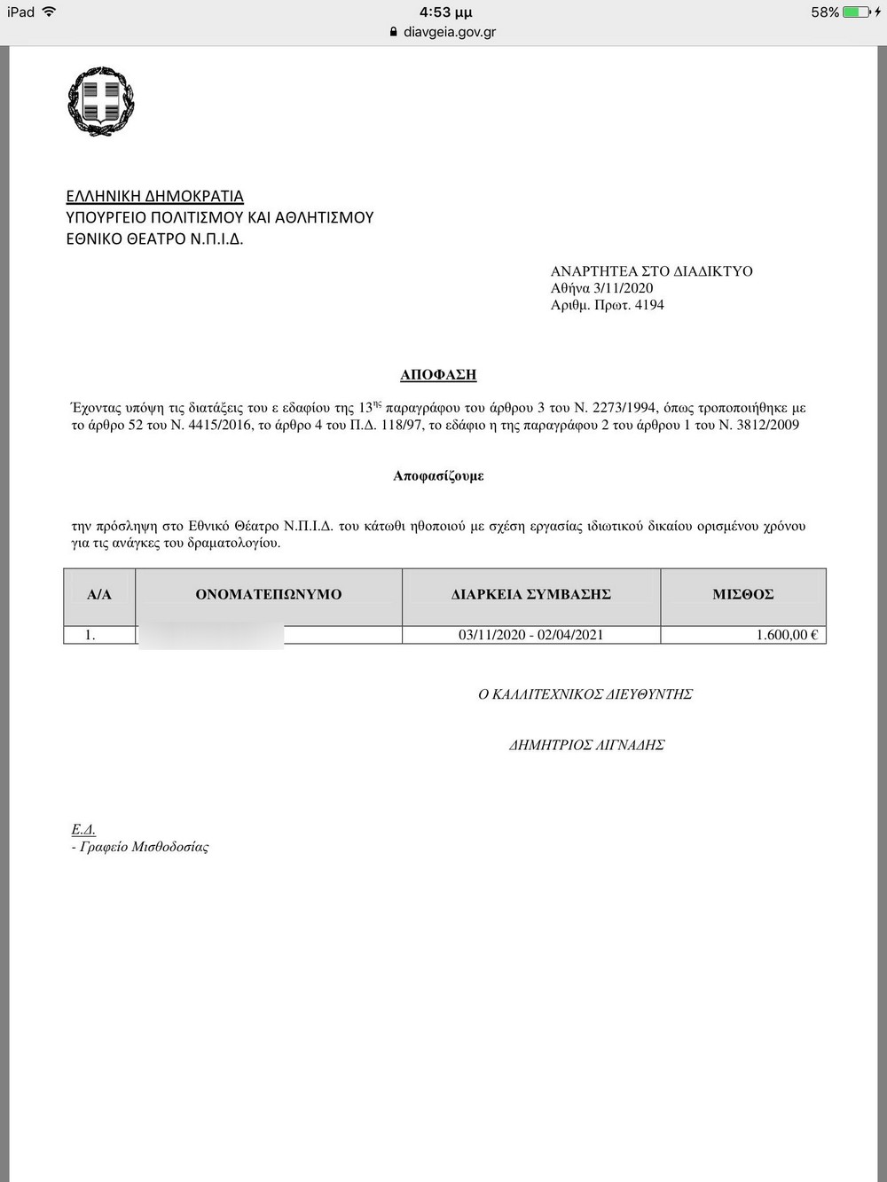 Κυρία Υπουργέ Πολιτισμού, διαβάζω εδώ στην Διαύγεια μια ενδιαφέρουσα ανάρτηση σχετική με πρόσληψη που έκανε ο καλλιτεχνικός διευθυντής του Εθνικού μας Θεάτρου Δημητρης Λιγνάδης. Λέω ‘θέατρό μας’ γιατί εμείς οι φορολογούμενοι συντηρούμε το Εθνικό, σε περίπτωση που σας διαφεύγει.