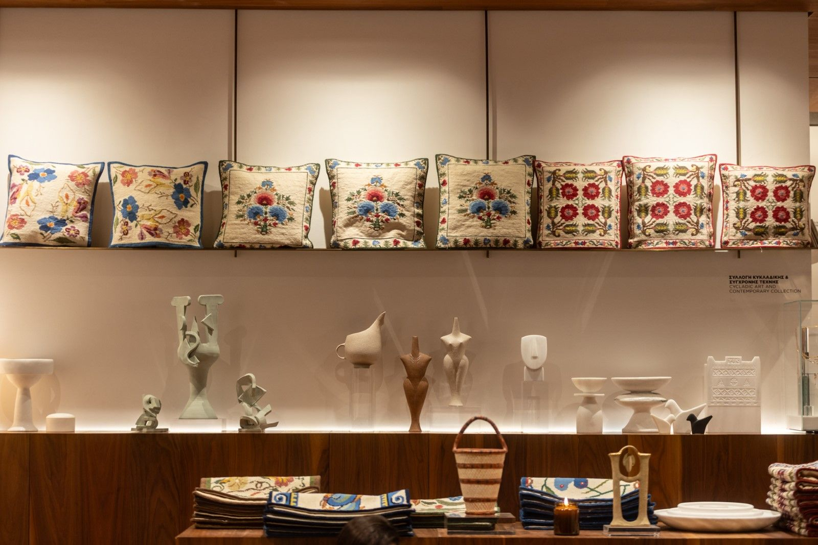 Δεκάδες χειροτεχνήματα γυναικών με πρωτότυπα σχέδια και παραδοσιακές τεχνικές, θα ζωντανέψουν την ελληνική οικοτεχνία στο Cycladic Shop. Τα έργα είναι εμπνευσμένα από τη μυθολογία, από μοτίβα της αρχαίας ελληνικής τέχνης και της λαϊκής παράδοσης αλλά και από έργα Ελλήνων εικαστικών του προηγούμενου αιώνα. Τα διακοσμητικά θέματα είναι εμπνευσμένα από τον πλούτο της ελληνικής φύσης, αρχαίες τοιχογραφίες, παραδοσιακά λαϊκά μοτίβα, λεπτομέρειες μουσειακών έργων, θέματα από τη βυζαντινή τέχνη καθώς και διασκευές νεότερων έργων.