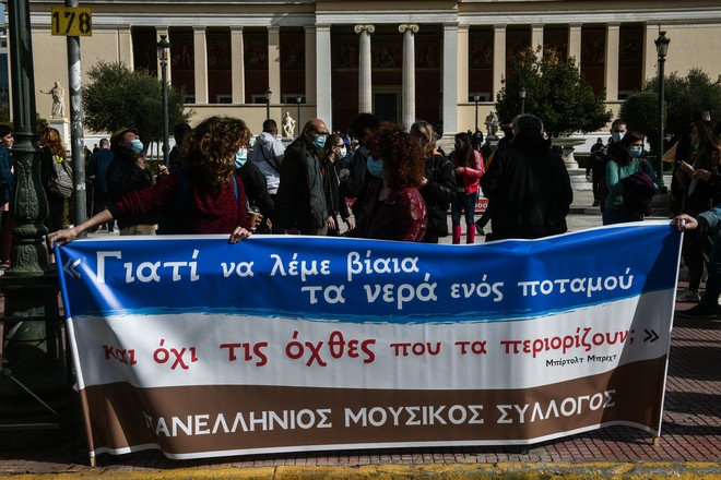 Συγκεκριμένα, ο Πανελλήνιος Μουσικός Σύλλογος μαζί με διάφορα πολιτιστικά σωματεία, αλλά και μεμονωμένους καλλιτέχνες, καταδίκασαν απερίφραστα το επίμαχο άρθρο 8 που θα δημιουργούσε ένα απόλυτα σκοταδιστικό τοπίο για την ελεύθερη έκφραση και προχώρησαν όχι μόνο σε λόγια, αλλά και πράξεις. Συγκεκριμένα, ο Σύλλογος συγκέντρωσε πάνω από 7.000 υπογραφές ενάντια στην εφαρμογή του “τρομονόμου” από καλλιτέχνες και κάλεσε σε παν-καλλιτεχνική διαμαρτυρία έξω από τη Βουλή, καταθέτοντας το ψήφισμα που βρήκε ευρεία αποδοχή.