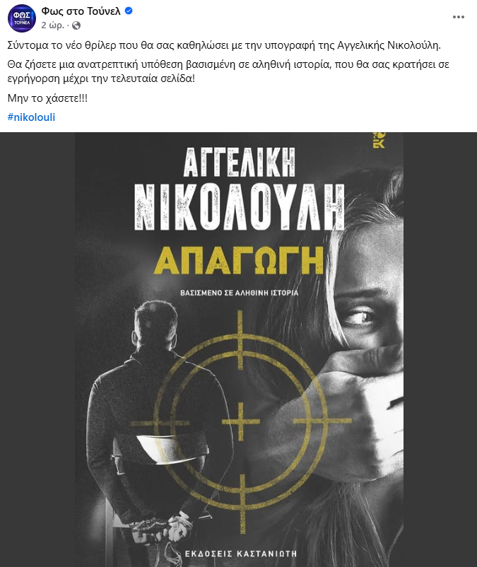 «Σύντομα το νέο θρίλερ που θα σας καθηλώσει με την υπογραφή της Αγγελικής Νικολούλη. Θα ζήσετε μια ανατρεπτική υπόθεση βασισμένη σε αληθινή ιστορία, που θα σας κρατήσει σε εγρήγορση μέχρι την τελευταία σελίδα! Μην το χάσετε!!!», αναφέρει η ανάρτηση.