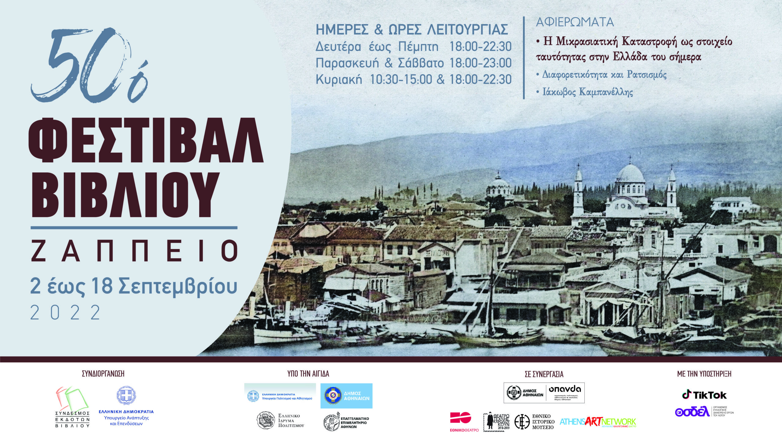 Με αφορμή τα 100 χρόνια από τη Μικρασιατική Καταστροφή, το 50ό Φεστιβάλ Βιβλίου φιλοξενεί στον χώρο του μια σειρά εκδηλώσεων γύρω από τη Μικρασιατική Καταστροφή ως στοιχείο ταυτότητας στην Ελλάδα του σήμερα, με τη συμμετοχή έγκριτων ομιλητών και πολιτιστικών φορέων. Ταυτόχρονα, το Φεστιβάλ Βιβλίου, αφουγκραζόμενο τα «σημεία των καιρών», δίνει βήμα σε ομιλίες ειδικών (ψυχολόγων-παιδαγωγών) με θέμα τη Διαφορετικότητα και τον Ρατσισμό στις διάφορες εκφάνσεις του. Τέλος, 10 χρόνια από τον θάνατο του ακαδημαϊκού, θεατρικού συγγραφέα και στιχουργού Ιάκωβου Καμπανέλλη, το Φεστιβάλ Βιβλίου οργανώνει ένα αφιέρωμα στη μεγάλη συμβολή του Έλληνα δημιουργού.