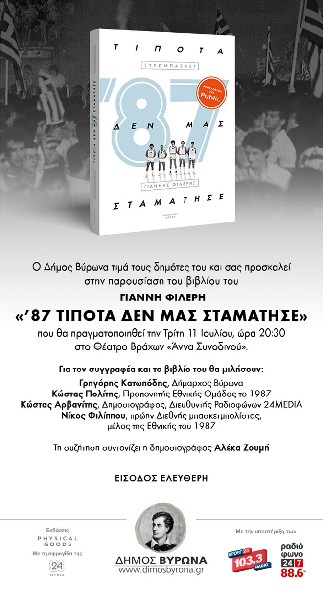 Το βιβλίο του Γιάννη Φιλέρη «’87 - Τίποτα δεν μας σταμάτησε» μιλά για τα καλάθια του Γκάλη, τις βουτιές του Γιαννάκη, τις τάπες του Φασούλα και το παραλήρημα της νίκης που είναι βαθιά χαραγμένα στη μνήμη όσων τα έζησαν και σε όσους τους τα διηγήθηκαν. Η παρουσίαση του βιβλίου θα γίνει την Τρίτη 11 Ιουλίου στο στο Θέατρο Βράχων «Άννα Συνοδινού»