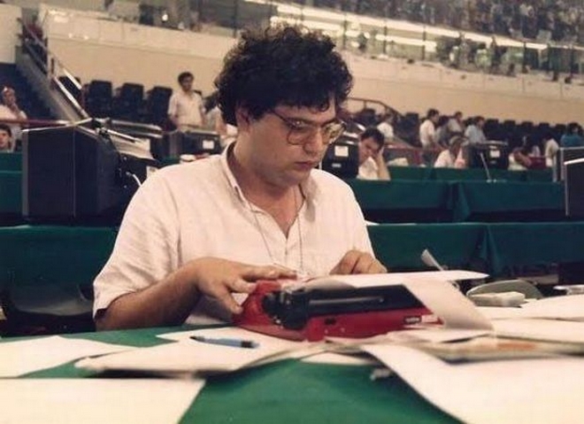 ο Φιλέρης, με θρυλική αφάνα και ακόμα πιο θρυλική γραφομηχανή, στο ΣΕΦ τις ημέρες του Ευρωμπάσκετ ’87