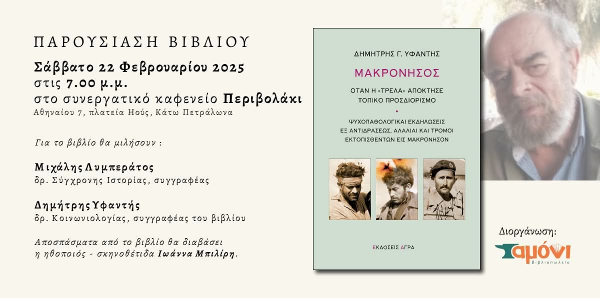 Το βιβλίο “Μακρόνησος: Όταν η “τρέλα” απόκτησε τοπικό προσδιορισμό” του Δημήτρη Υφαντή ερευνά τις ιστορίες των εξορίστων που στιγματίστηκαν ως “τρελοί”, αναζητώντας την αλήθεια πίσω από αυτή τη βαριά ταμπέλα.