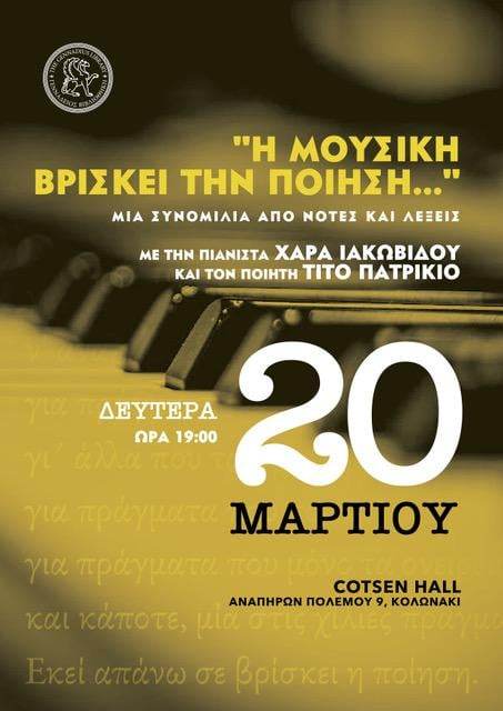 Τη Δευτέρα 20 Μαρτίου μία ξεχωριστή εκδήλωση με ποίηση του Τίτου Πατρίκιου και νότες της Χαράς Ιακωβίδου