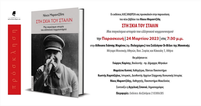 Στην παρουσίαση του νέου βιβλίου του Νίκου Μαραντζίδη “Στη Σκιά του Στάλιν” μάς προσκαλούν οι εκδόσεις ΑΛΕΞΑΝΔΡΕΙΑ την Παρασκευή 24 Μαρτίου 2023 στις 7:30 μ.μ. στην Αίθουσα Γιάννης Μαρίνος (πρ. Πολυχώρος) του Συλλόγου “Οι Φίλοι της Μουσικής” στο Μέγαρο Μουσικής Αθηνών.