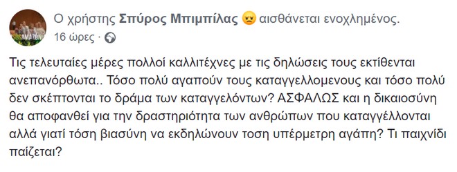 “Τις τελευταίες μέρες πολλοί καλλιτέχνες με τις δηλώσεις τους εκτίθενται ανεπανόρθωτα.. Τόσο πολύ αγαπούν τους καταγγελλομενους και τόσο πολύ δεν σκέπτονται το δράμα των καταγγελόντων? ΑΣΦΑΛΩΣ και η δικαιοσύνη θα αποφανθεί για την δραστηριότητα των ανθρώπων που καταγγέλλονται αλλά γιατί τόση βιασύνη να εκδηλώνουν τοση υπέρμετρη αγάπη? Τι παιχνίδι παίζεται;” έγραψε ο πρόεδρος του Σωματείου Ελλήνων Ηθοποιών στο Facebook.