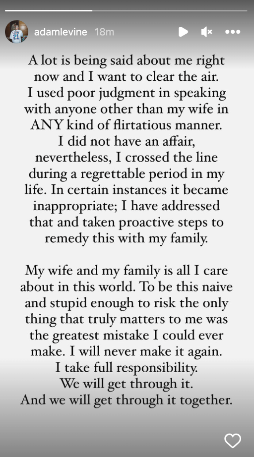 Μετά από τα δημοσιεύματα που αναφέρουν ότι απάτησε τη σύζυγό του Behati Prinsloo και ήθελε να ονομάσει το παιδί τους με το όνομα της υποτιθέμενης ερωμένης του, ο Adam Levine απάντησε μέσα από ένα Story στον Instagram.