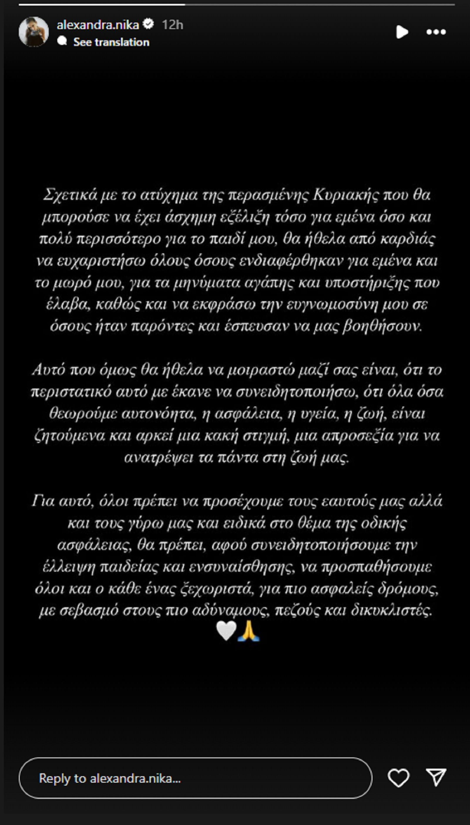 Με ένα story στο Instagram η Αλεξάνδρα Νίκα μίλησε για το ατύχημα που είχε την περασμένη Κυριακή, το οποίο όπως έγραψε «θα μπορούσε να είχε τραγικές συνέπειες τόσο για εμένα όσο και για το παιδί μου».