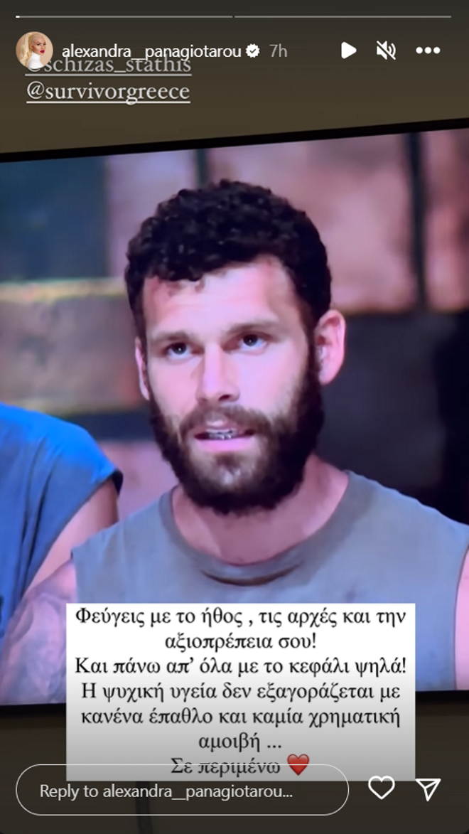 Στηρίζοντας την απόφαση του συντρόφου της, η Αλεξάνδρα Παναγιώταρου, η οποία δεν δίστασε να πετάξει πριν μερικές ημέρες το δικό της “καρφί” για την Ελευθερία Ελευθερίου, δημοσίευσε στον λογαριασμό της στο Instagram ένα μέρος όσων έλεγε στο Survivor ο Στάθης Σχίζας, γράφοντας χαρακτηριστικά: “Φεύγεις με το ήθος, τις αρχές και την αξιοπρέπειά σου! Και πάνω από όλα με το κεφάλι ψηλά! Η ψυχική υγεία δεν εξαγοράζεται με κανένα έπαθλο και καμία χρηματική αμοιβή…. Σε περιμένω“.