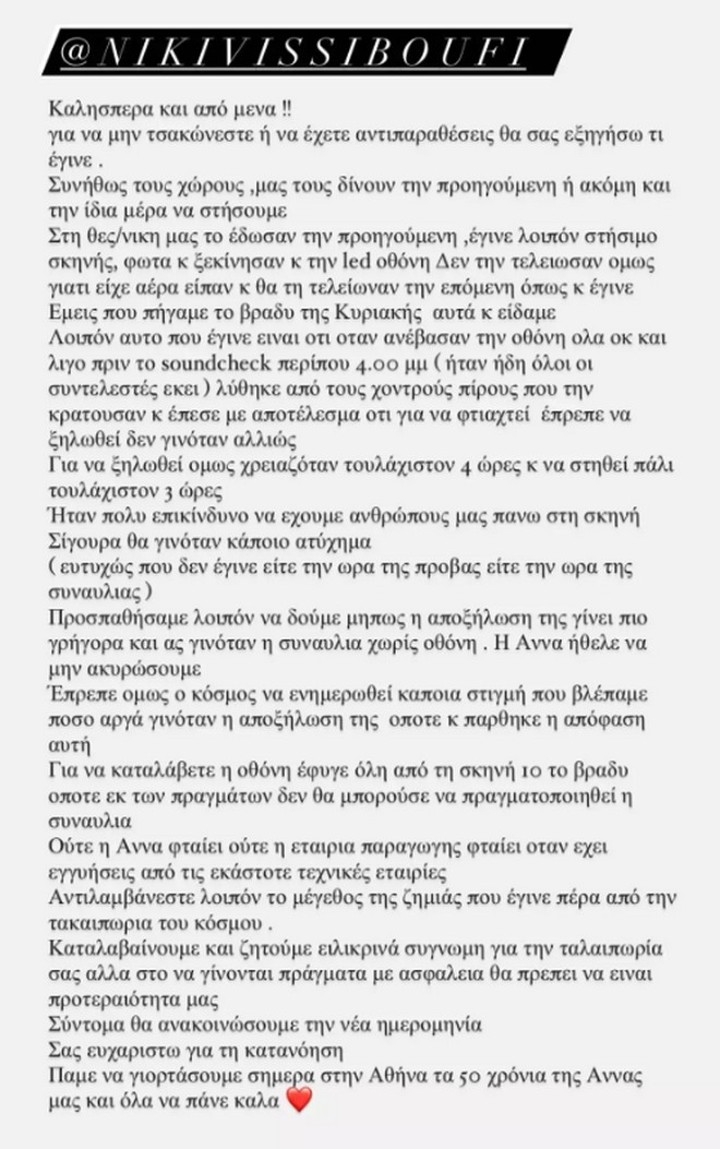 Σύντομα θα ανακοινώσουμε νέα ημερομηνία. Σας ευχαριστώ για την κατανόηση. Πάμε να γιορτάσουμε σήμερα στην Αθήνα τα 50 χρόνια της Άννας μας και όλα να πάνε καλά».