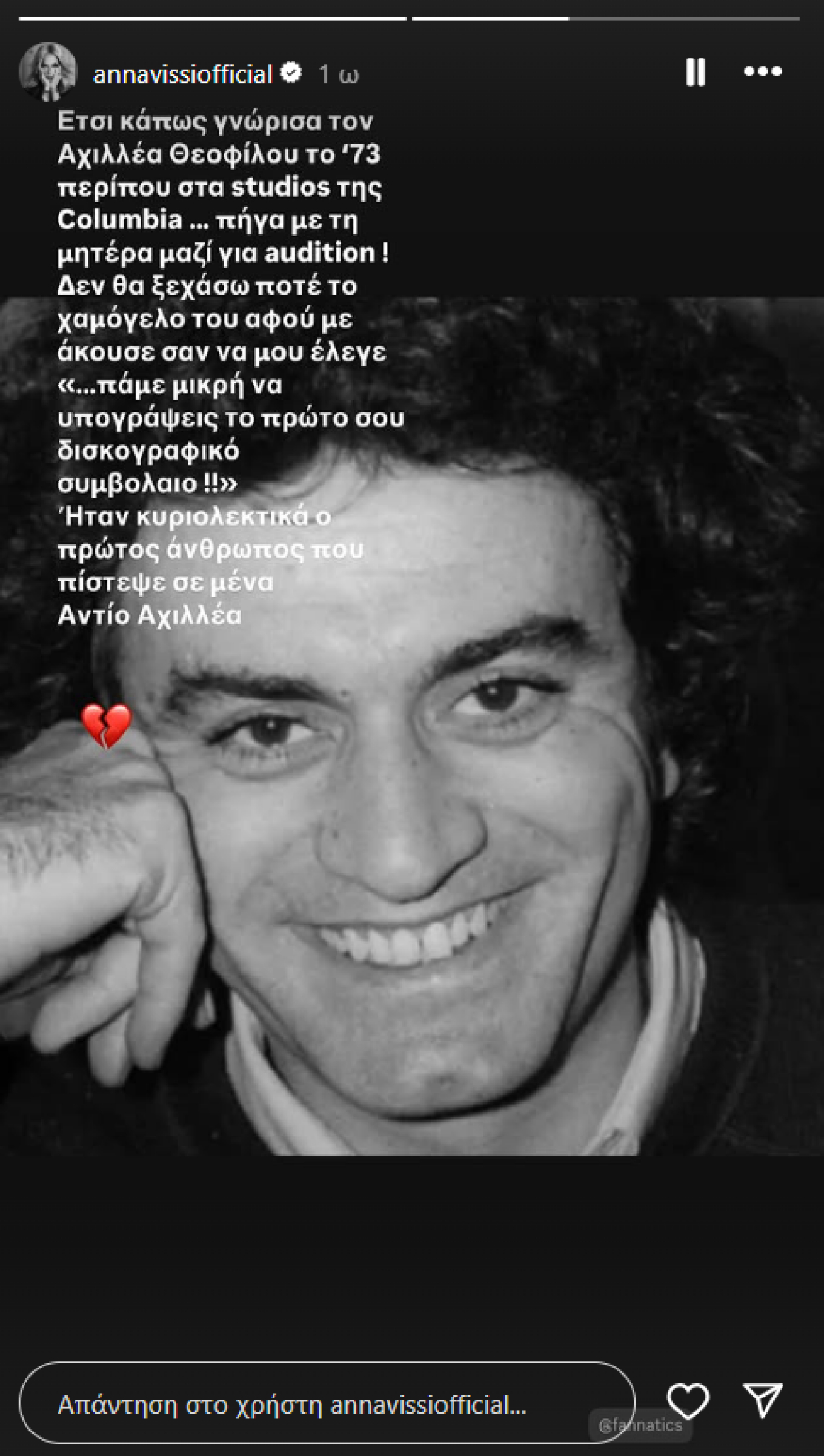 Συγκεκριμένα, δημοσίευσε μια φωτογραφία του Αχιλλέα Θεοφίλου, λέγοντας πως είχε βρεθεί για οντισιόν στο στούντιό του. Όπως χαρακτηριστικά έγραψε η Άννα Βίσση, ο μουσικός παραγωγός ήταν από τα πρώτα πρόσωπα, που πίστεψαν στις δυνατότητές της.