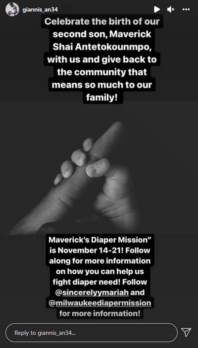 “Γιορτάστε μαζί μας την γέννηση του δεύτερου γιου μας, του Μάβερικ Σάι Αντετοκούνμπο και προσφέρετε στην κοινότητα, που τόση σημασία έχει για την οικογένειά μας. Το Maverick’s Diaper Mission θα γίνει 14-21 Νοέμβρη. Ακολουθήστε μας για περισσότερες πληροφορίες σχετικά με την καταπολέμηση της ανάγκης για πάνες”, έγραψε ο Γιάννης Αντετοκούνμπο.