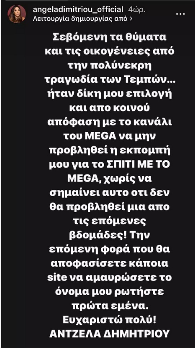 «Σεβόμενη τα θύματα και τις οικογένειες από την πολύνεκρη τραγωδία των Τεμπών, ήταν δική μου επιλογή και από κοινού απόφαση με το κανάλι του Mega να μην προβληθεί η εκπομπή μου για το Σπίτι με το Mega, χωρίς να σημαίνει αυτό ότι δε θα προβληθεί μια από τις επόμενες εβδομάδες! Την επόμενη φορά που θα αποφασίσετε κάποια site να αμαυρώσετε το όνομά μου, ρωτήστε πρώτα εμένα. Ευχαριστώ πολύ!», έγραψε χαρακτηριστικά η Άντζελα Δημητρίου.