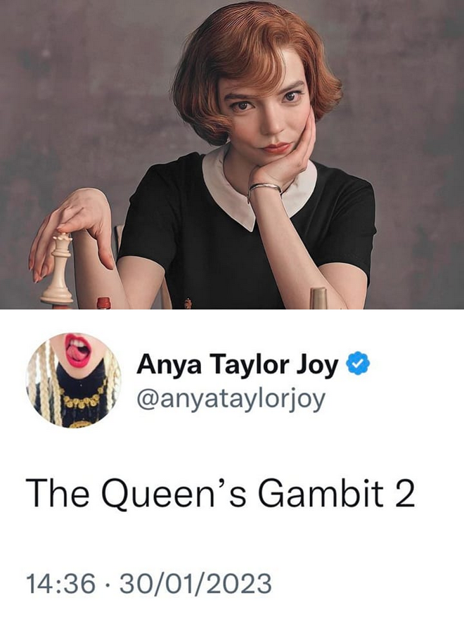 Συγκεκριμένα, η Anya υποτίθεται ότι δημοσίευσε στο Twitter το εξής “The Queen’s Gambit 2”. Η ανάρτηση έλαβε τουλάχιστον 4.733 likes και προβλήθηκε περισσότερες από 30.000 φορές, με τους φανς της σε όλο τον κόσμο να παθαίνουν “φρενίτιδα” για την ανακοίνωση της δεύτερης σεζόν της σειράς.