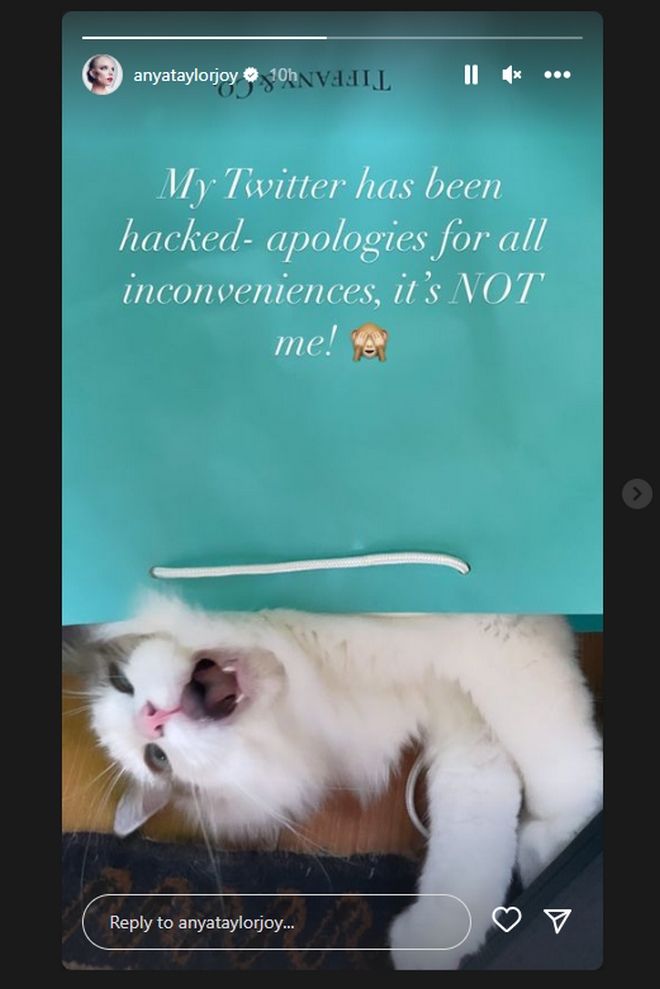 Τελικά, η Anya Taylor Joy προχώρησε σε μια ανάρτηση στα Instagram Stories της την Δευτέρα (30/01), ενημερώνοντας τους θαυμαστές της πως ο λογαριασμός της στο Twitter είχε χακαριστεί – και επομένως δεν ισχύει κάτι τέτοιο.