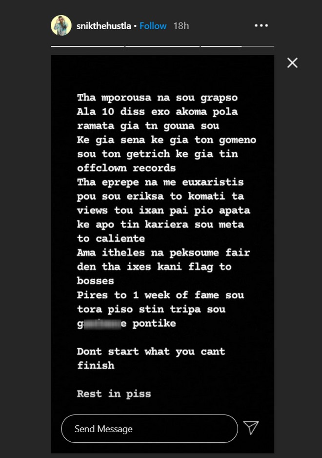 Ο SNIK έγραψε χαρακτηριστικά στο insta story του: “Θα μπορούσα να σου γράψω άλλα 10 diss, έχω ακόμα πολλά ράμματα για τη γούνα σου. Και για σένα και για τον getrich και για την offclown records. Θα έπρεπε να με ευχαριστείς που σου έριξα το κομμάτι τα views σου είχαν πάει πιο άπατα και από την καριέρα σου μετά το Caliente. Άμα ήθελες να παίξουμε fair δε θα είχες κάνει flag το bosses. Πήρες τη μια εβδομάδα δημοσιότητάς σου. Τώρα πίσω στην τρύπα σου. Μην ξεκινάς κάτι που δε μπορείς να τελειώσεις”.