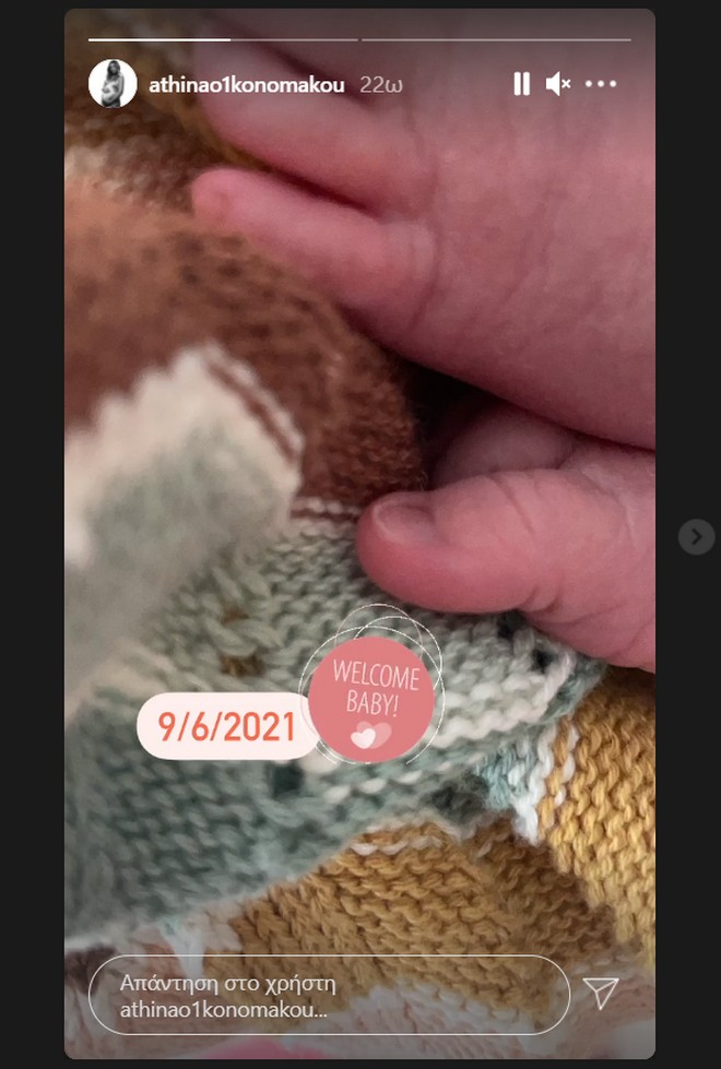 Η Αθηνά Οικονομάκου ανακοίνωσε τα χαρμόσυνα νέα λίγες μέρες μετά τη γέννα, ανεβάζοντας ένα insta story με το χεράκι του μωρού, ενώ δημοσίευσε μία ανάρτηση στην οποία ευχαριστούσε το προσωπικό της κλινικής.