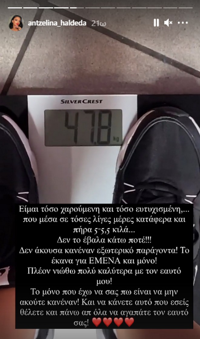 “Είμαι τόσο χαρούμενη και τόσο ευτυχισμένη… που μέσα σε τόσες λίγες ημέρες κατάφερα και πήρα 5,5 – 5 κιλά… Δεν το έβαλα κάτω ποτέ!!! Δεν άκουσα κανέναν εξωτερικό παράγοντα! Το έκανα για ΕΜΕΝΑ και μόνο! Πλέον νιώθω πολύ καλύτερα με τον εαυτό μου! Το μόνο που έχω να σας πως είναι να μην ακούτε κανέναν! Και να κάνετε αυτό που εσείς θέλετε και πάνω από όλα να αγαπάτε τον εαυτό σας”, έγραψε η Αντζελίνα, αναρτώντας μια φωτογραφία από την ζυγαριά της.