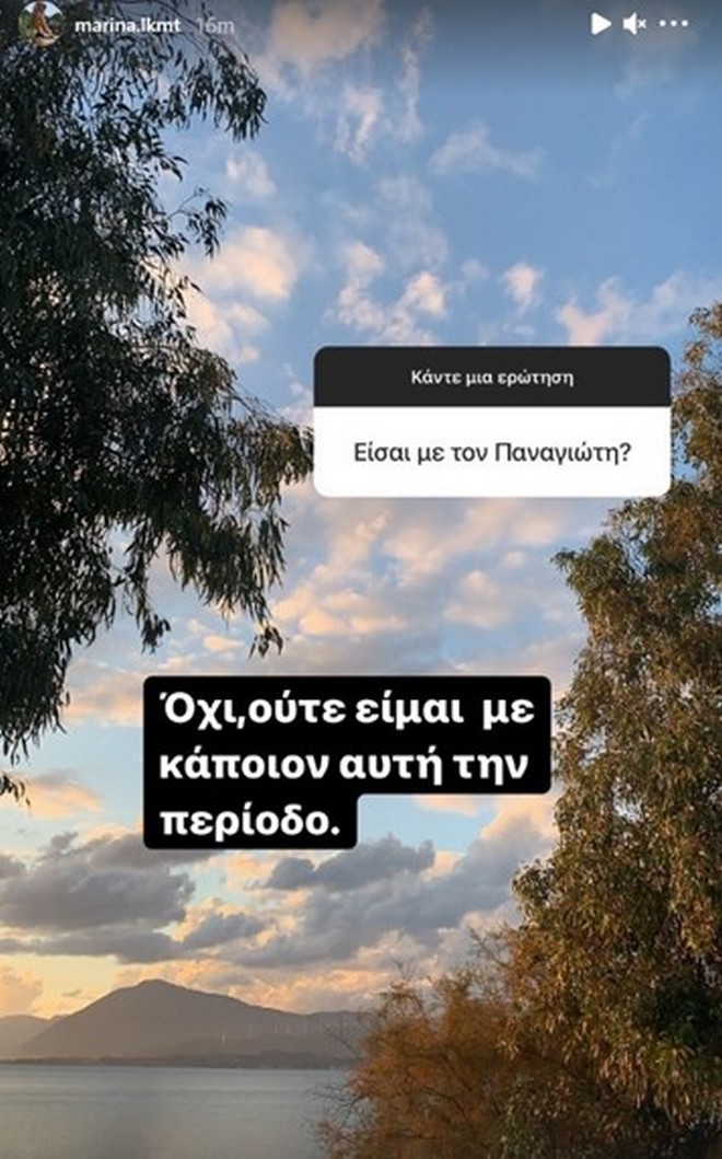 Το ζευγάρι είχε διαψεύσει τις φήμες που ανέφεραν πως έχουν χωρίσει και πως ο Παναγιώτης βρήκε τον έρωτα στο πρόσωπο της Μαρίνας την Κυριακή που μας πέρασε με ένα story στο Instagram.