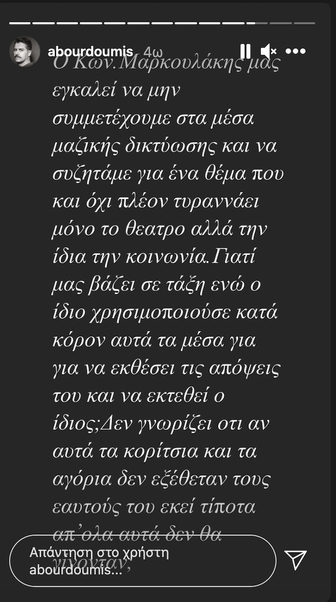 Μετά την συνέντευξη που έδωσε σήμερα (19/2) ο Κωνσταντίνος Μαρκουλάκης στην εκπομπή “Πάμε Δανάη!”, ο ηθοποιός Αλέξανδρος Μπουρδούμης αντέδρασε στα λεγόμενα του, μέσω Instagram.