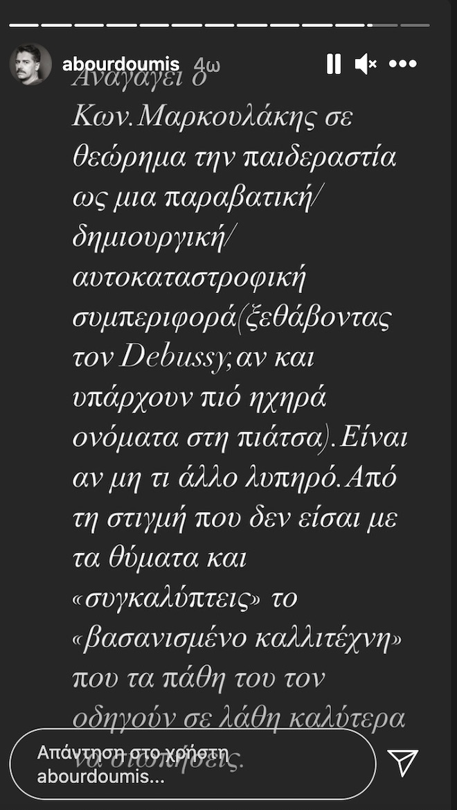 "Από τη στιγμή που δεν είσαι με τα θύματα και "συγκαλύπτεις" τον "βασανισμένο καλλιτέχνη" που τα πάθη του τον οδηγούν σε λάθη καλύτερα να σιωπήσεις" σημειώνει ο κ. Μπουρδούμης σε απάντηση στον κ. Μαρκουλάκη.
