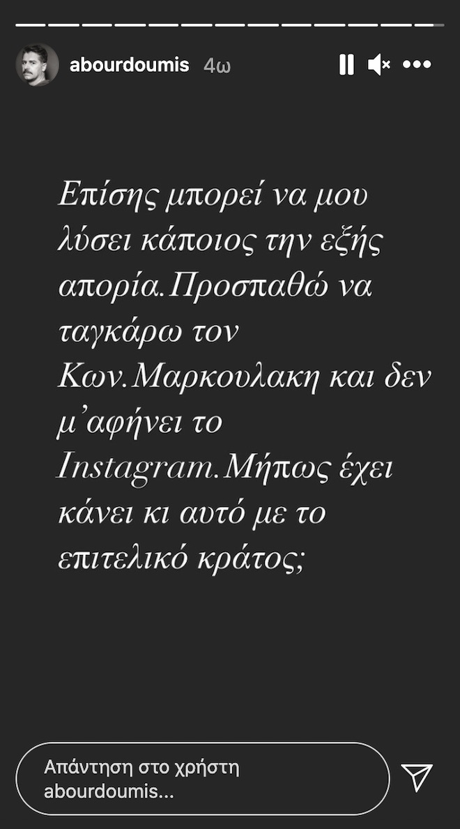 Προσπαθώ να ταγκάρω τον Κων. Μαρκουλάκη και δεν με αφήνει το Instagram. Μήπως έχει να κάνει και αυτό με το επιτελικό κράτος;» έγραψε ο Αλέξανδρος Μπουρδούμης μετά τα όσα είπε ο Κωνσταντίνος Μαρκουλάκης, το πρωί της Παρασκευής (19/2) στο Mega.