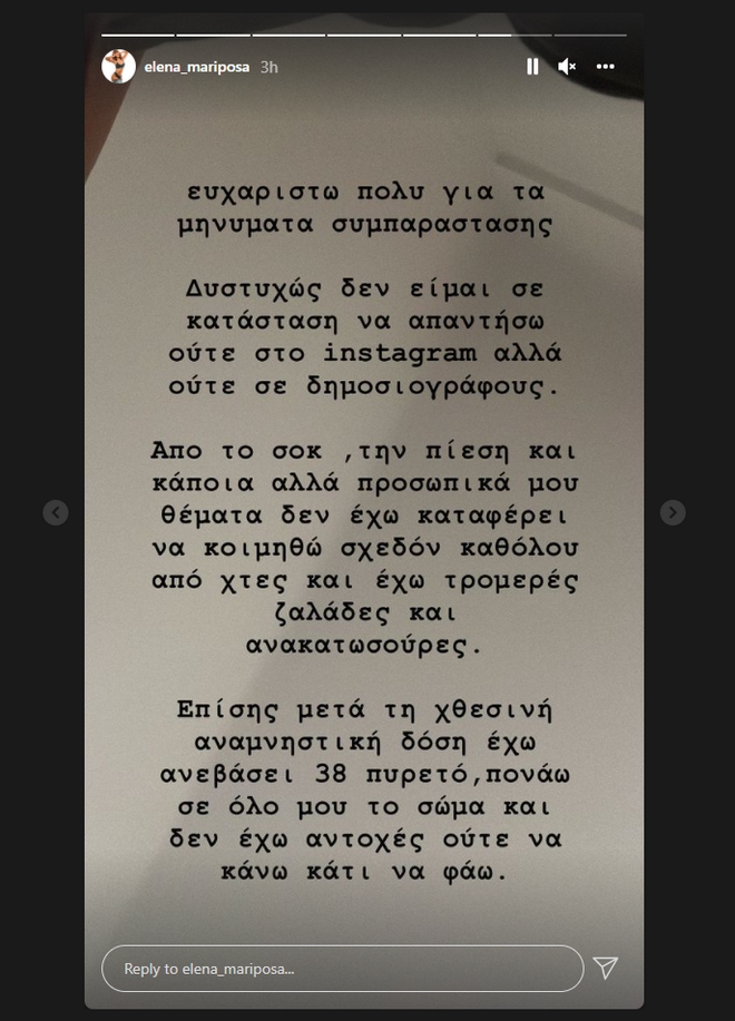 “Ευχαριστώ πολύ για τα μηνύματα συμπαράστασης. Δυστυχώς δεν είμαι σε κατάσταση να απαντήσω ούτε στο Instagram ούτε στους δημοσιογράφους. Από το σοκ, την πίεση και κάποια άλλα προσωπικά μου θέματα δεν έχω καταφέρει να κοιμηθώ σχεδόν καθόλου από χθες και έχω τρομερές ζαλάδες και ανακατωσούρες.