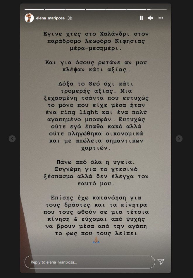 Μια ξεχασμένη τσάντα που ευτυχώς το μόνο που είχε μέσα ήταν ένα ring light και ένα πολύ αγαπημένο μπουφάν. Ευτυχώς ούτε εγώ έπαθα κακό ούτε πληγώθηκα οικονομικά και με απώλεια σημαντικών χαρτιών. Πάνω απ’ όλα η υγεία. Συγγνώμη για το χθεσινό ξέσπασμα αλλά δεν ήλεγχα τον εαυτό μου. Επίσης έχω κατανόηση για τους δράστες και τα κίνητρα που τους ώθησαν σε μια τέτοια κίνηση και εύχομαι από ψυχής να βρουν μέσα από την αγάπη το φως που τους λείπει”.