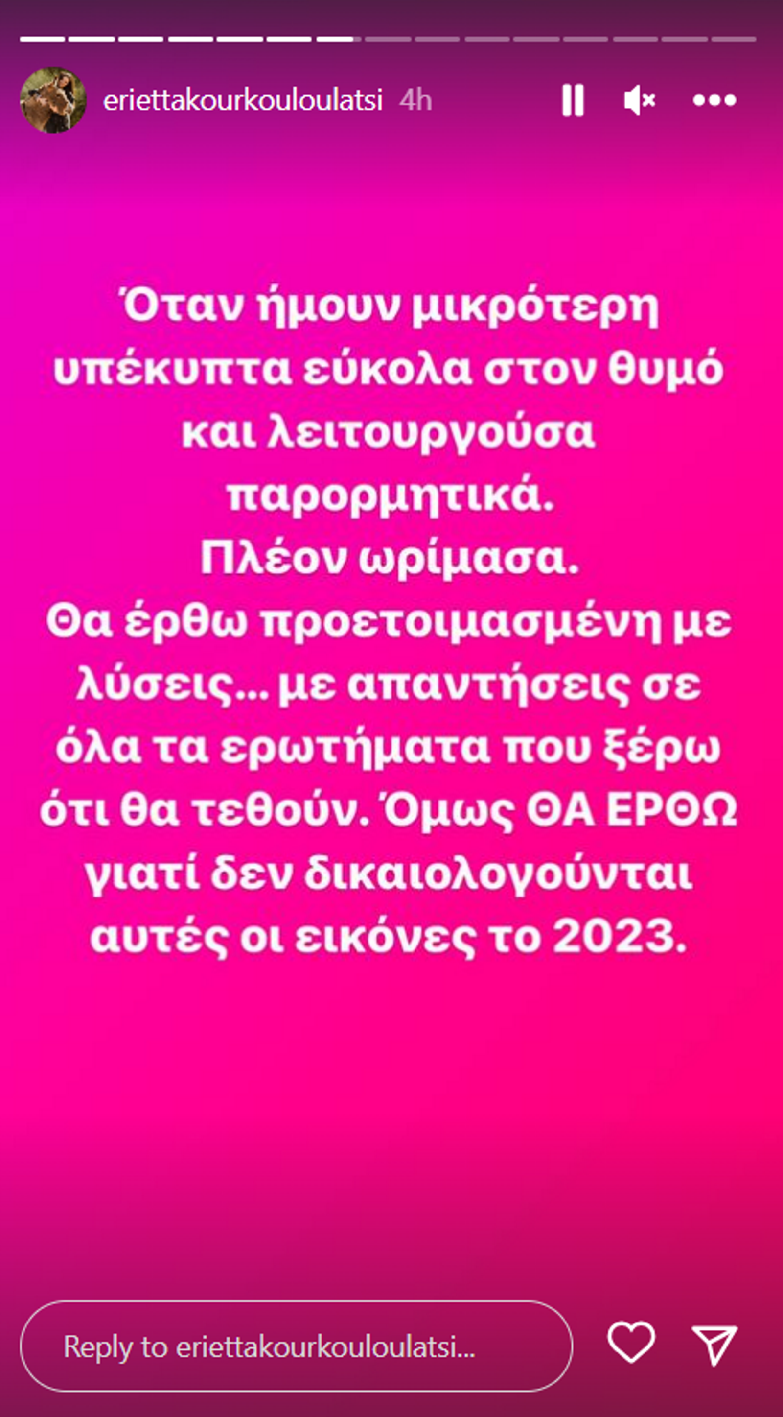 “Όταν ήμουν μικρότερη υπέκυπτα εύκολα στον θυμό και λειτουργούσα παρορμητικά. Πλέον ωρίμασα. Θα έρθω προετοιμασμένη με λύσεις. Με απαντήσεις σε όλα τα ερωτήματα που ξέρω ότι θα τεθούν. Όμως θα έρθω γιατί δεν δικαιολογούνται αυτές οι εικόνες το 2023“, έγραψε.